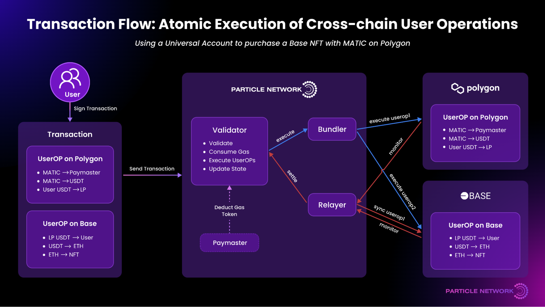 It tackles various aspects of chain abstraction, including account management, gas payments, liquidity, and transaction settlement. Here's how Particle Network addresses different aspects of chain abstraction: