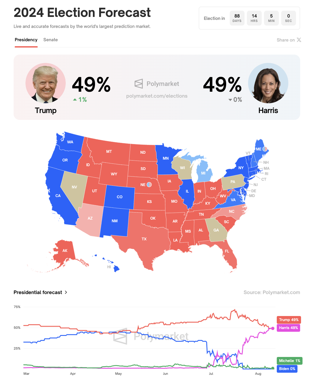 As the U.S. presidential election approaches, Polymarket has been driving the revival of prediction markets this year. Public opinion about elections is highly volatile, and many stakeholders have sufficient motivation to distort reality. In this situation, Polymarket has stood out by capturing predictions such as a high likelihood of Kamala Harris being nominated as the Democratic candidate and JD Vance being selected as Trump's vice presidential candidate before official announcements.