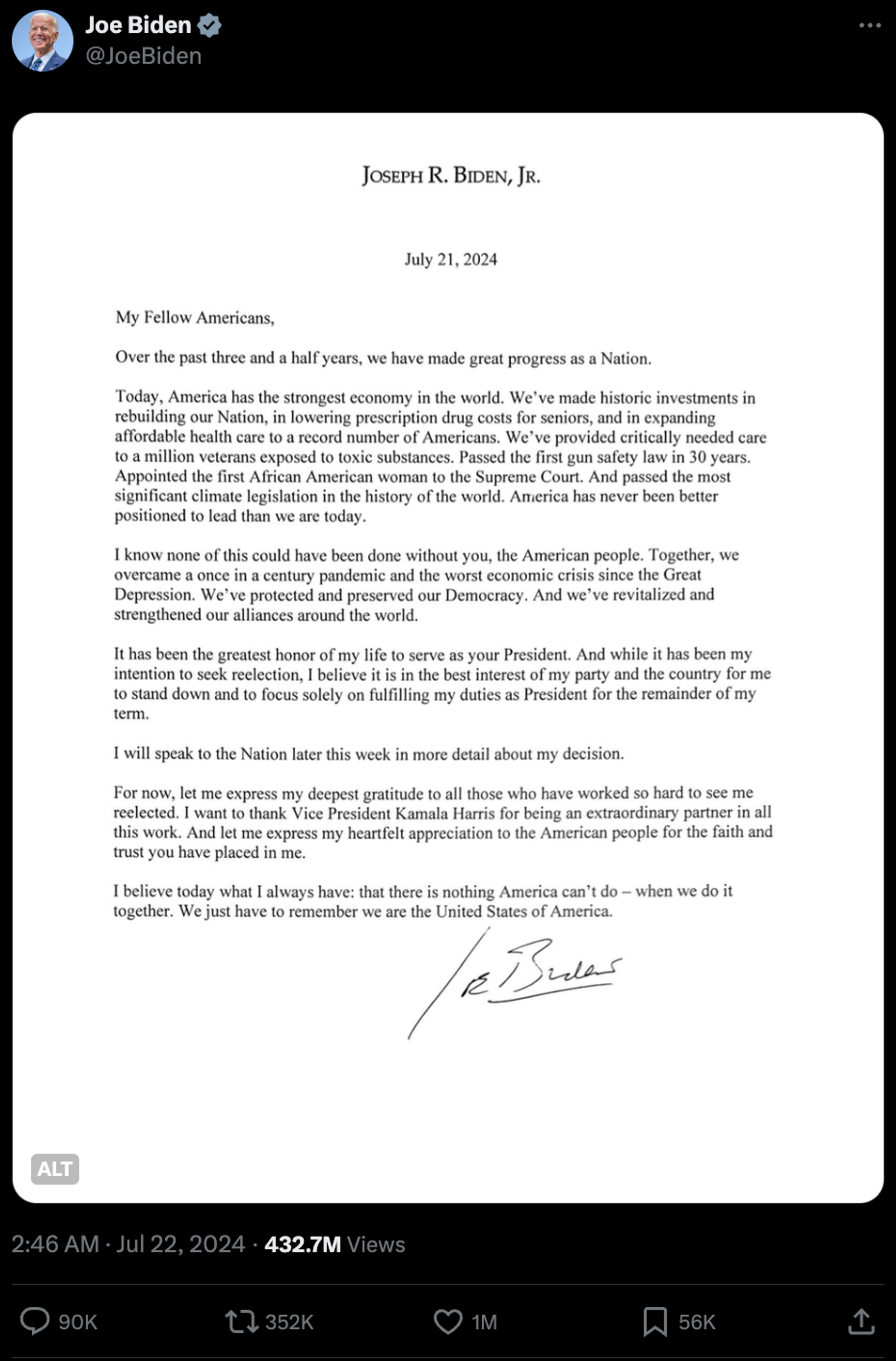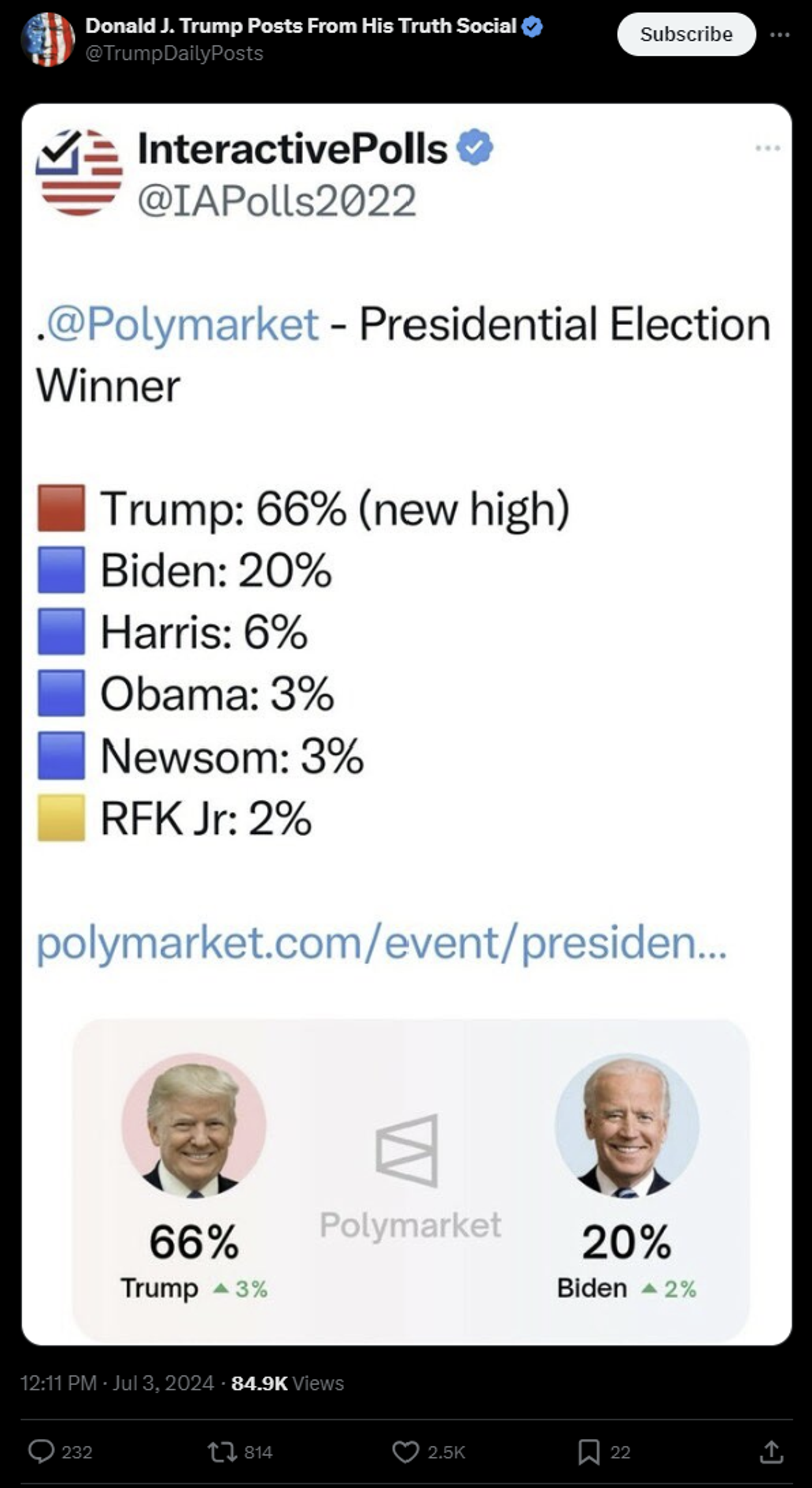 Until Joe Biden announced his decision to drop out of the U.S. presidential race in July 2024, as Biden's health issues became apparent, the media and social media were flooded with all sorts of speculation and opinions about whether he would resign his candidacy. Meanwhile, on Polymarket, a prediction market on the topic "Will Biden drop out of presidential race?" was opened in September 2023, long before Biden decided to resign, and betting continued with about $20 million flowing into this market over 10 months.