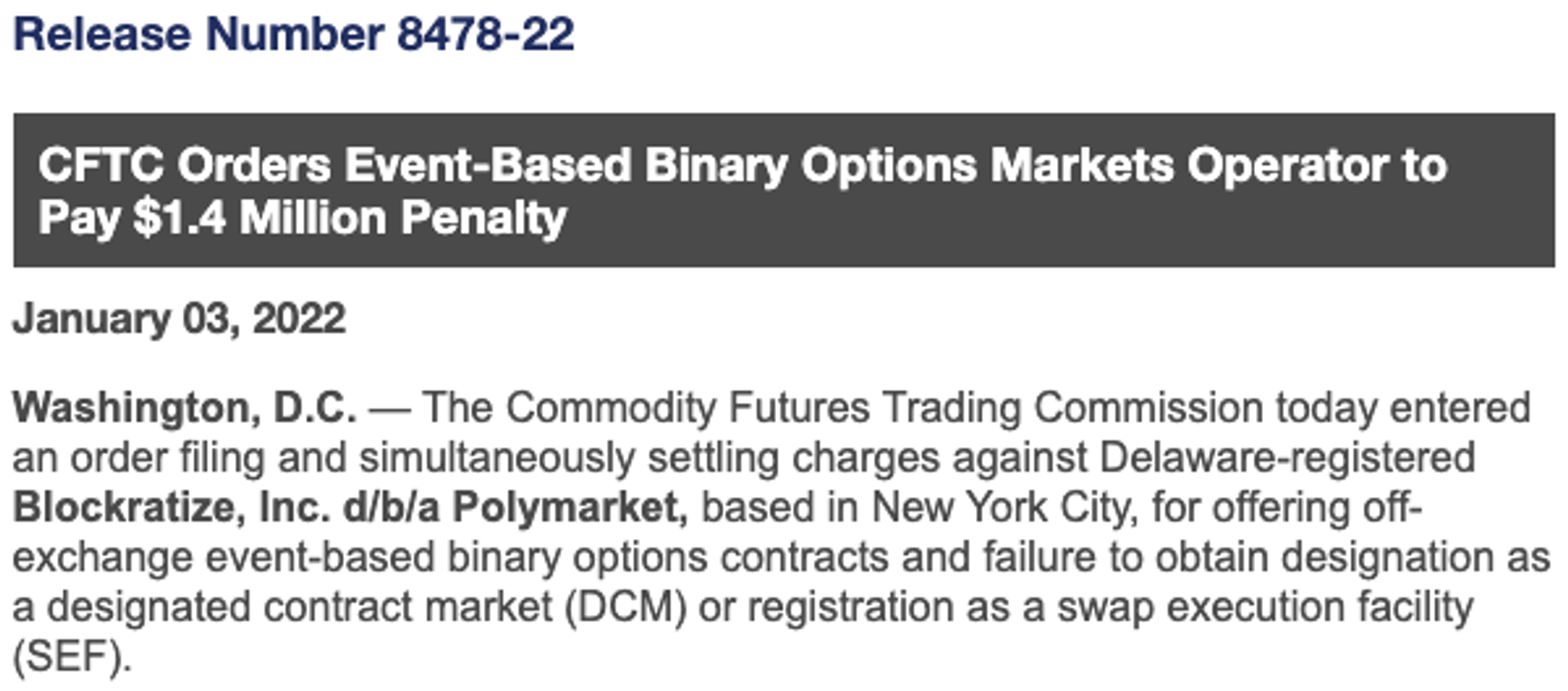 Despite Polymarket's promising start and high market expectations, the platform faced a significant crisis before it could fully establish itself. In January 2022, the U.S. Commodity Futures Trading Commission(CFTC) hit Polymarket with a $1.4 million fine and ordered it to cease operations in the United States for failing to comply with essential regulatory measures. The CFTC alleged that since 2020, Polymarket had been illegally offering online trading services for event-based binary options without proper registration.