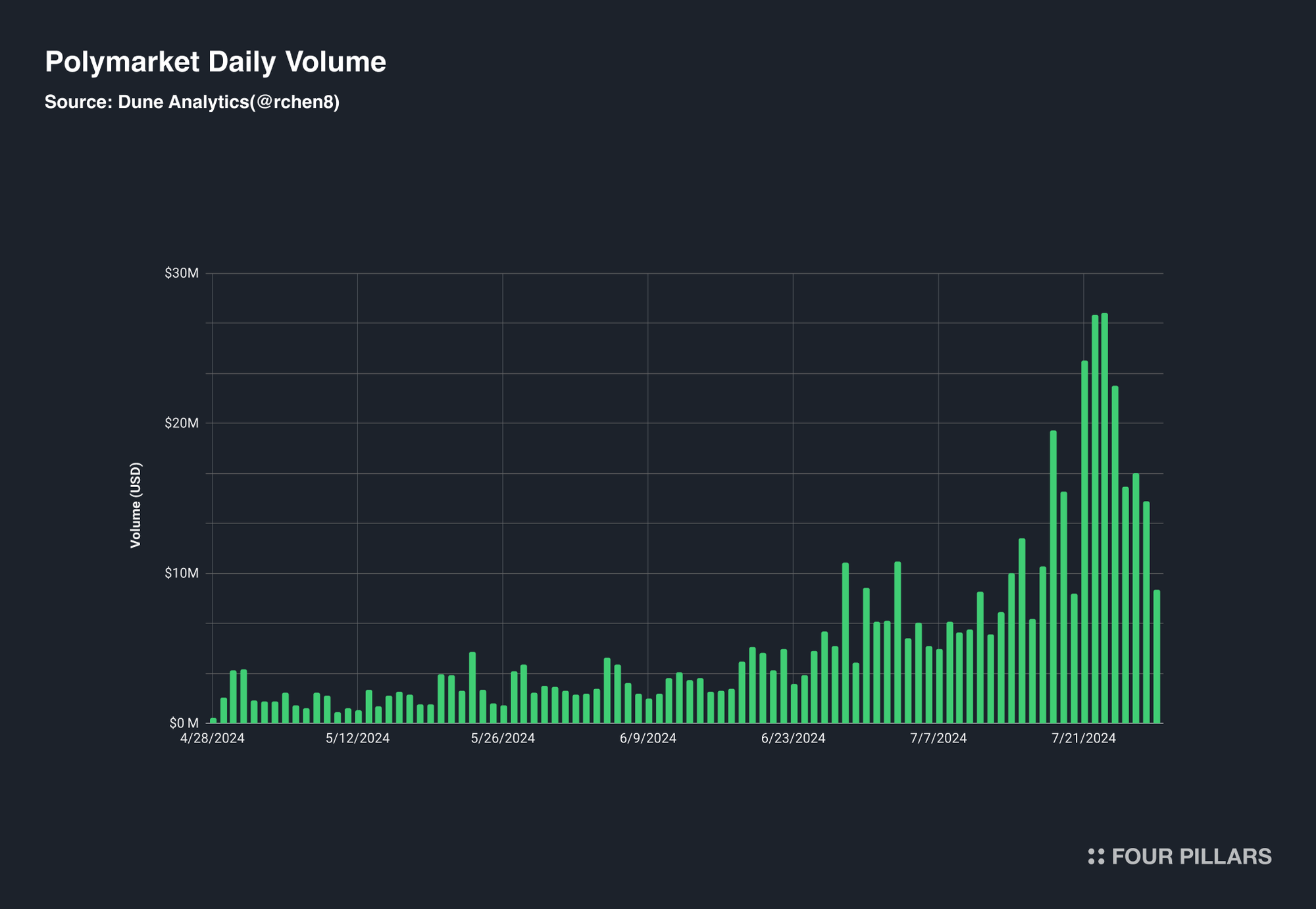 As of June 2024, Polymarket is experiencing unprecedented growth. The platform's monthly trading volume has surpassed $110 million, with about 3,000 traders conducting over 10,000 transactions daily. On the first day of the U.S. presidential election campaign alone, approximately 4,000 traders participated in Polymarket's prediction markets. Recently, as interest in the election intensified, the platform recorded a daily trading volume approaching $30 million.