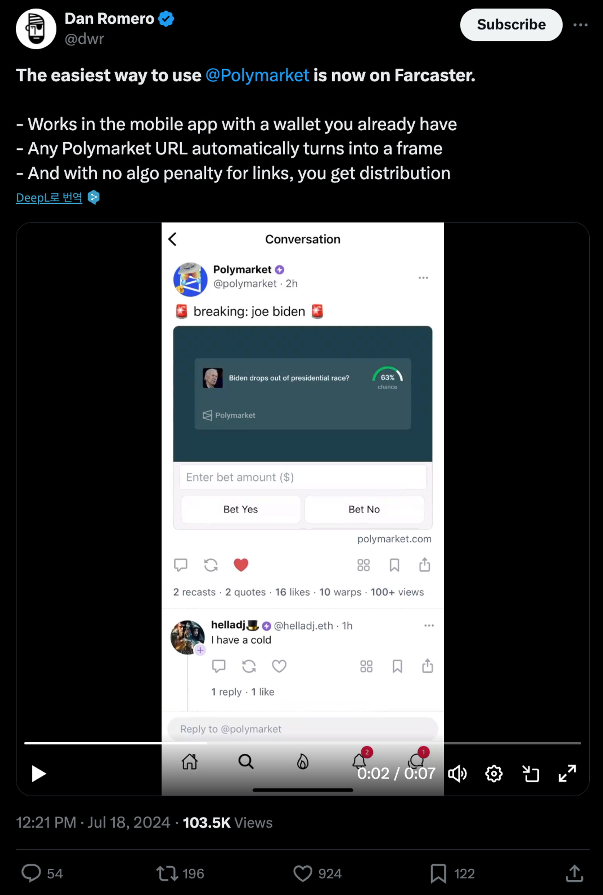 Given the inherent nature of prediction markets that necessitate discussion, the integration of Polymarket with social applications presents the most natural interoperability model. The social network protocol Farcaster features a Frame that allows users to execute Polymarket prediction market bets directly within the Farcaster application. Frame is a feature that embeds interactive applications within Farcaster's social feed, enabling direct execution of other applications within the social feed without the need to navigate to external platforms. By utilizing the Polymarket Frame, users can automatically convert Polymarket URLs into Frames, allowing them to place bets directly within Farcaster using Coinbase Wallet, which is optimized for mobile environments.