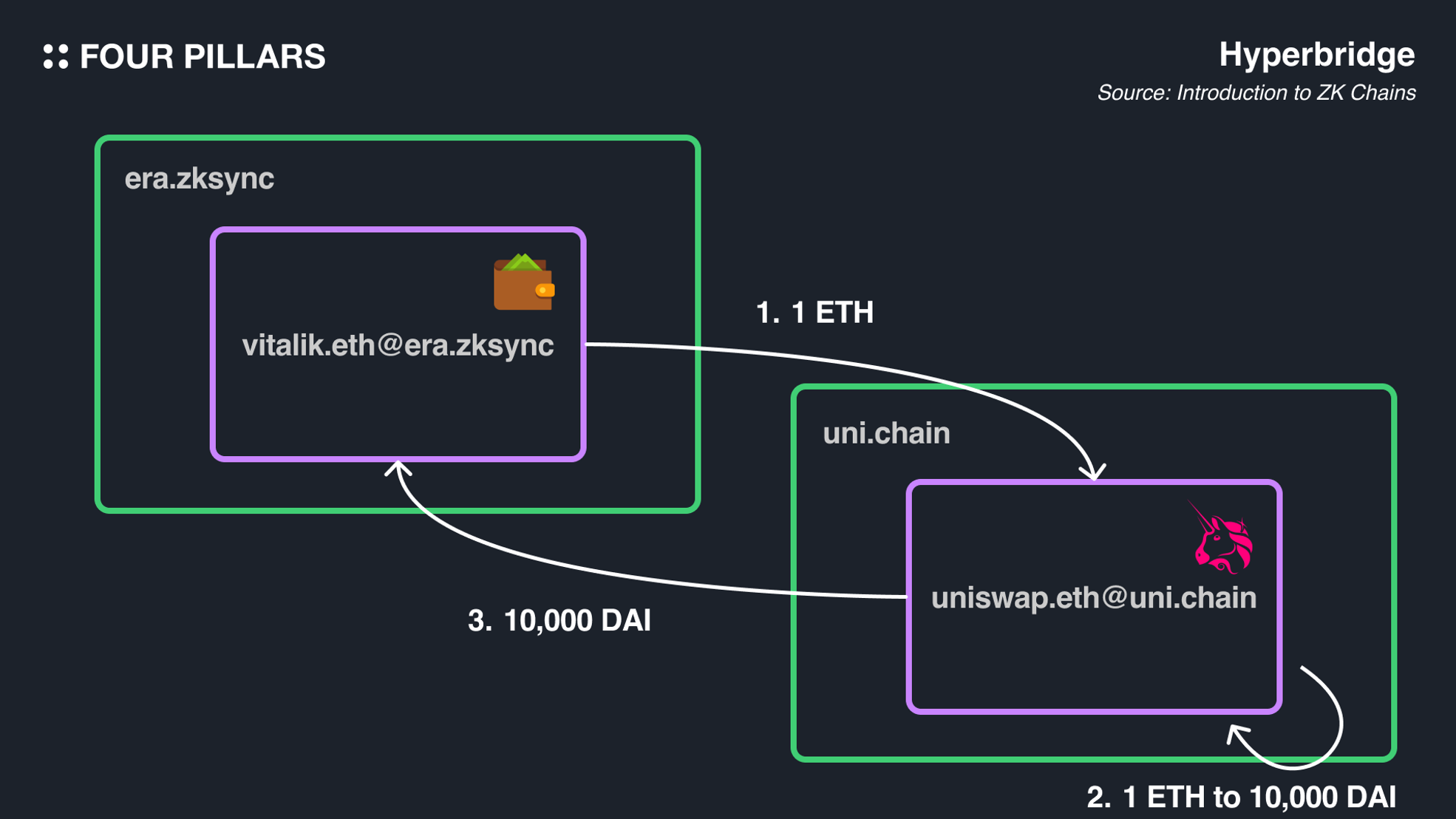 For instance, if using cross-chain Uniswap, and a user on era.zksync chain wants to swap 1 ETH for 10,000 DAI, the process would be: