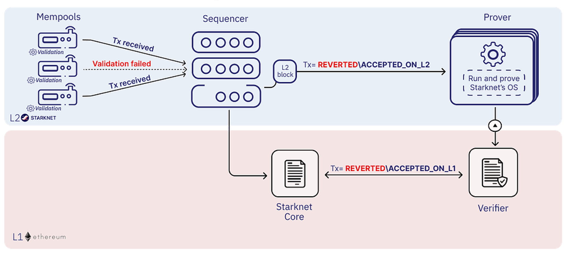Settlement: Data generated on Layer 2 is transmitted to Layer 1 (such as Ethereum), where components accept transactions and manage proofs and state differences. These components are processed by two smart contracts: the verifier contract and the Starknet core contract. The verifier contract analyzes the proofs received from Layer 2 and exercises veto power on transactions if any issues are found. If the proof's validity is confirmed, it is transferred to the Starknet core contract, which updates the Layer 1 chain with the provided state changes. This updated state is added to the Layer 1 chain block, and once the block passes through Layer 1's processes, it falls under Layer 1's influence.