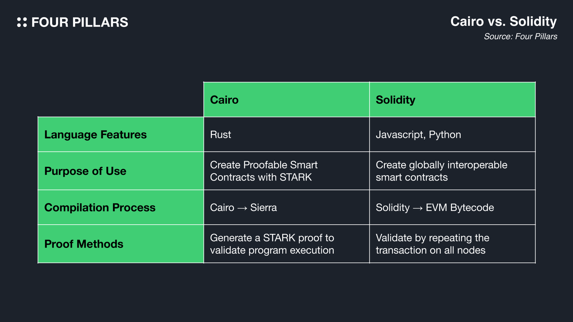 The key differences between Cairo and Solidity are outlined in the table below.