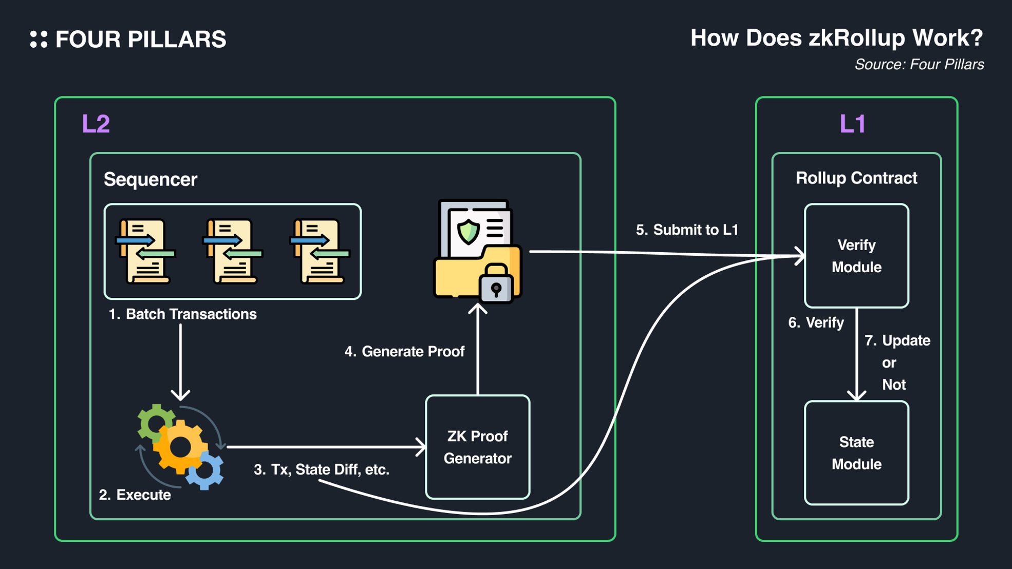 Proof Verification: The zk-proof and related data are submitted to a verifier contract on the settlement layer (mostly on Ethereum) for verification. If valid, the rollup contract updates its state to reflect the new post-state, and after a short time buffer, the change is finalized.