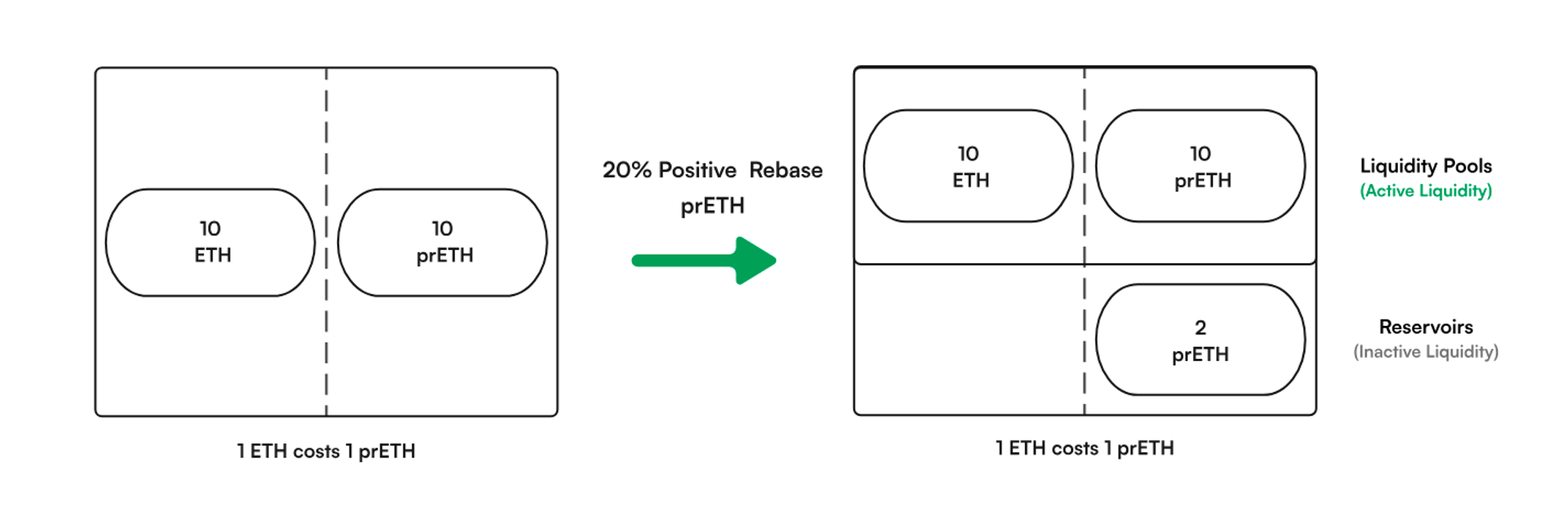Reservoir는 각 토큰 쌍에 대한 비활성 유동성에 해당하는 추가 토큰 가치를 의미한다. 가치를 축적하는 토큰의 가치가 상승할 때, 그 추가 가치는 활성 풀이 아닌 Reservoir에 축적된다. Reservoir는 스테이킹 보상이나 수익을 축적하여 이러한 이득이 차익 거래에 의해 손실되는 것을 방지하고 활성 유동성 풀에서 정확한 가격을 유지하게끔 한다. Poolside 내에서 Rebase 토큰, 예를 들어 stETH와 같은 토큰은 보상이나 가치 변화를 반영하여 공급량을 조정한다. 이러한 조정은 활성 유동성 풀에 영향을 미치지 않고 Reservoir에서 처리되어 유동성 제공자의 가치를 보존하고 안정적인 가격 역학을 유지하는 데 사용된다. 또한, Poolside는 공급량이 고정된 토큰을 위한 Wrapper를 구현하여 리베이싱 방식이 아닌 토큰을 Poolside의 Reservior 시스템에 적용될 수 있는 방안을 제공한다.