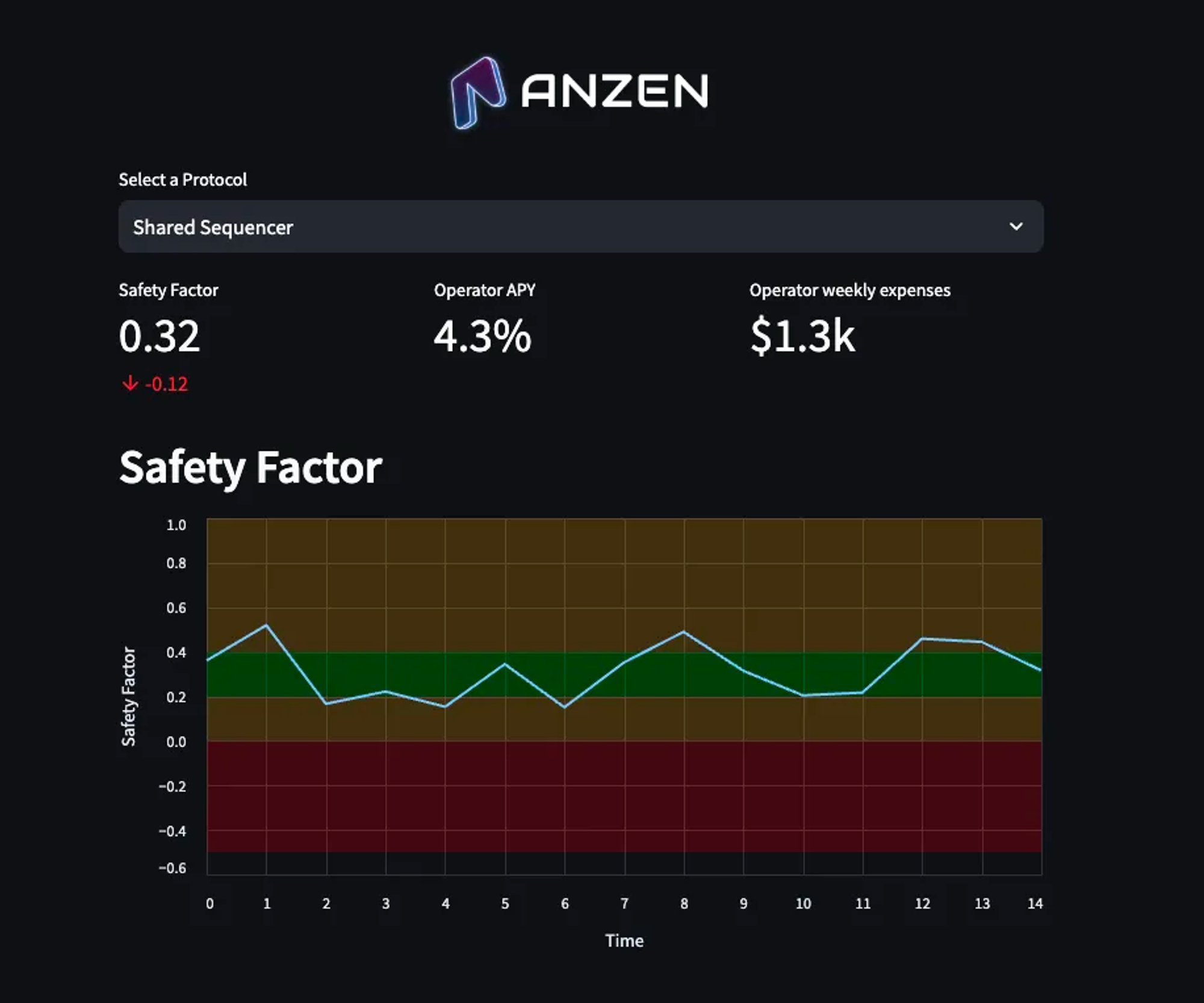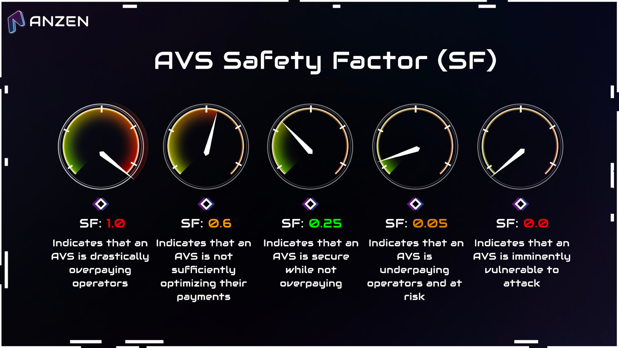 Anzen가 제공하는 기능으로는 '안전계수(Safety Factor, SF)' 지표가 있다. SF는 AVS의 보안이 위협받았을 때 얻을 수 있는 최대의 이익과 Restaking 된 자본의 가치를 비교함으로써 AVS의 경제적 안전성을 평가한다. SF는 적절한 보안 수준을 유지하면서 자원의 낭비를 방지하는 균형을 찾기 위한 척도로 활용될 수 있다.