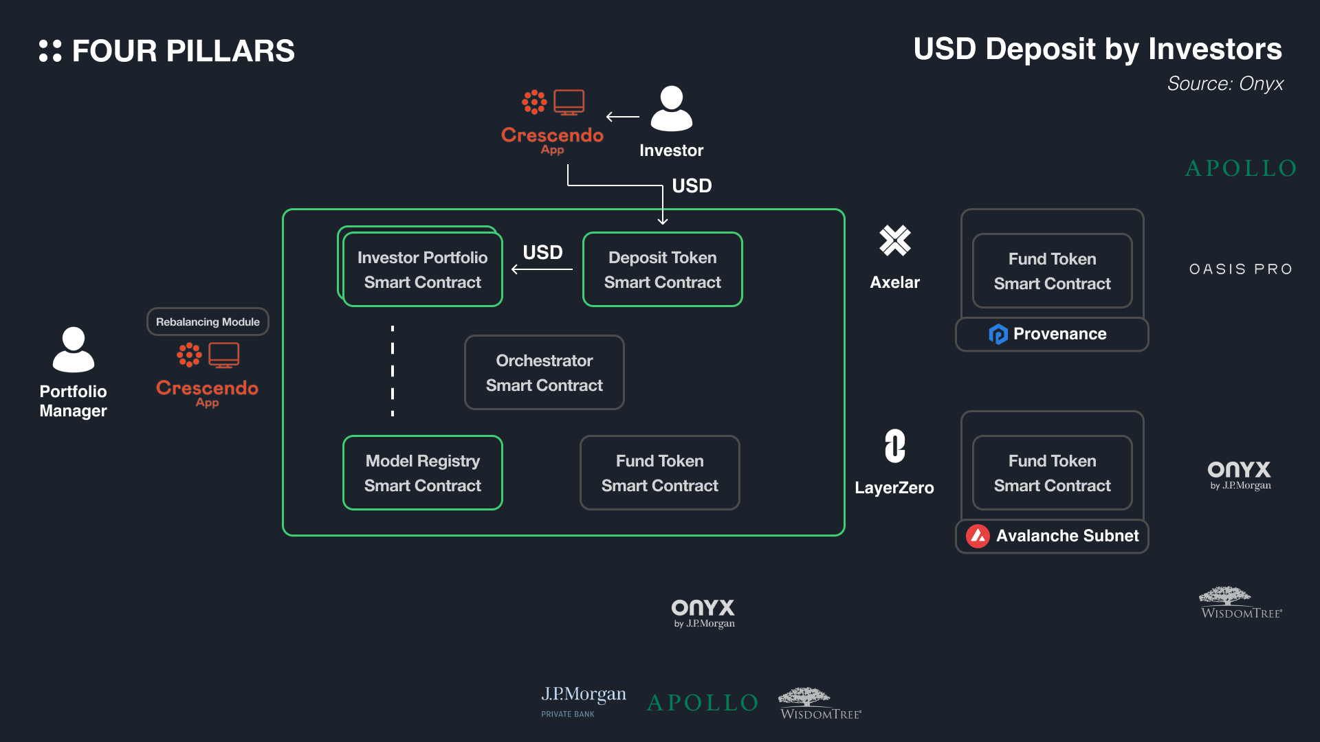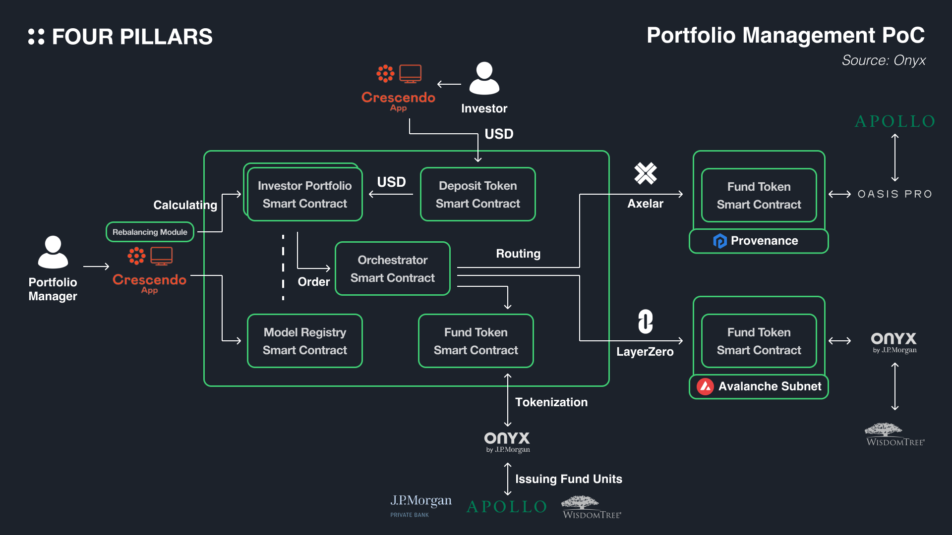 ์ด PoC ์คํ์ ๋ชฉ์ ์ ํฌํธํด๋ฆฌ์ค ๋งค๋์ ๊ฐ ๋ชจ๋ธ ํฌํธํด๋ฆฌ์ค๋ฅผ ์ค์ ํ๊ณ , ๋ธ๋ก์ฒด์ธ๊ณผ ์ค๋งํธ ์ปจํธ๋ํธ๋ฅผ ํตํด 1) ๋์ฒดํฌ์์์ฐ(Alts)์ ์ฝ๊ฒ ํธ์ ํ ์ ์๋ ํฌํธํด๋ฆฌ์ค๋ฅผ 2) ์ฌ๋ฌ ๋คํธ์ํฌ(Onyx Digital Assets, Avalanche Subnet, Provenance Blockchain)์ ๊ฑธ์ณ์ 3) ์ค๋งํธ ์ปจํธ๋ํธ๋ฅผ ์ด์ฉํ ์๋ํ ๋ฐฉ์์ผ๋ก ํจ์จ์ ์ผ๋ก ๊ด๋ฆฌํ๋ฉฐ 4) ๋น ๋ฅด๊ฒ ์ ์ฐ(settlement)ํ๋ ๊ฒ์ด๋ค.