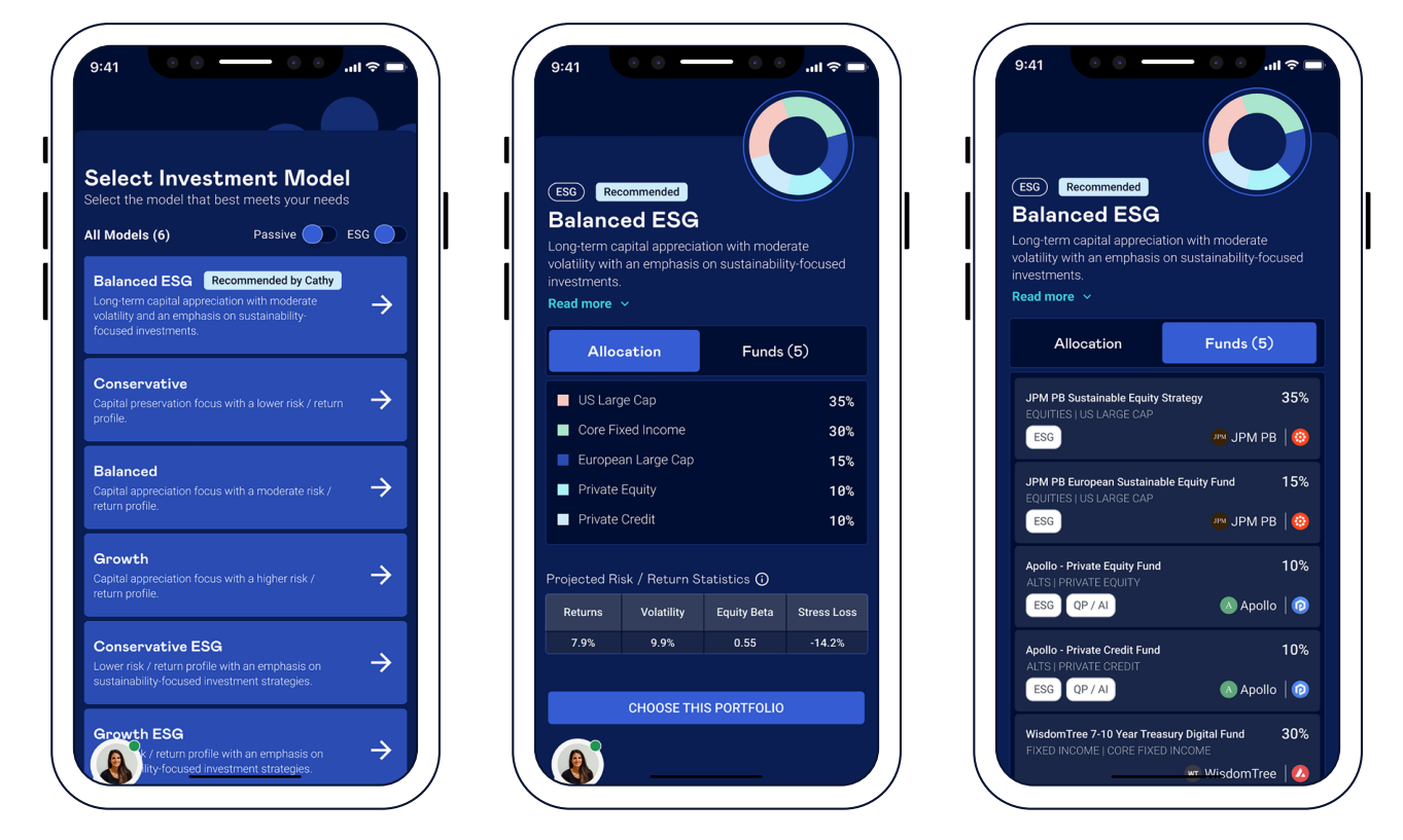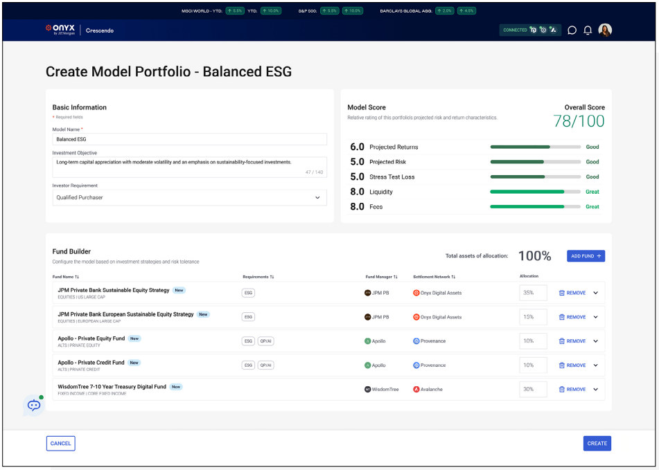 ํฌํธํด๋ฆฌ์ค ๋งค๋์ ๋ Crescendo App์ด๋ผ๋ ํ๋ก ํธ์๋๋ฅผ ํตํด ์์คํ ๊ณผ ์ํธ์์ฉํ์ฌ ๋ชจ๋ธ ํฌํธํด๋ฆฌ์ค๋ฅผ ์์ฑํ๋ค. ๋ชจ๋ธ ํฌํธํด๋ฆฌ์ค๋ ํฌํธํด๋ฆฌ์ค ๋งค๋์ ๊ฐ ํฌ์์์๊ฒ ์ ์ํ๋ ์์ฐ์ ์ข ๋ฅ, ๋น์ค, ์ํ๋ ๋ฑ์ ๋ด์ฉ์ด ํฌํจ๋ ๋ชจ๋ธ์ด๋ค. ์ ํผ๊ท์ด๋ ํฌํธํด๋ฆฌ์ค ๋งค๋์ ๊ฐ Balanced ESG์ ์ด๋ฆ์ ๊ฐ๋ ๋ชจ๋ธ ํฌํธํด๋ฆฌ์ค๋ฅผ ์์ฑํ๋ ์์์ด๋ฉฐ, ๊ฐ ๋ธ๋ก์ฒด์ธ ์์ ์๋ ํ๋ ํ ํฐ๋ค์ ์ข ๋ฅ์ ๋น์ค์ ์ค์ ํ ์ ์๋ค.