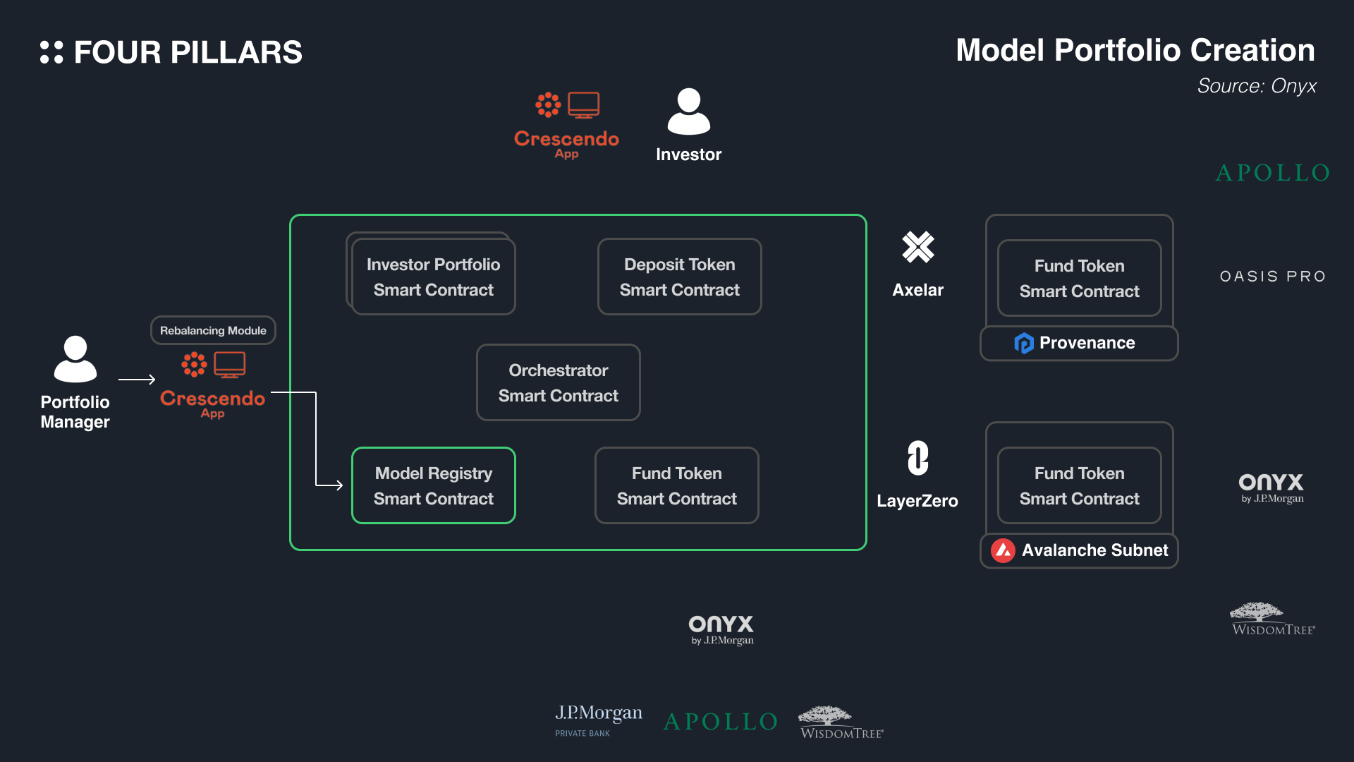 ๋ฐฑ์๋์์๋ ๋ชจ๋ธ ํฌํธํด๋ฆฌ์ค์ ๋ํ ์ ๋ณด๊ฐ โModel Registry Smart Contractโ์ ๋ฑ๋ก๋๋ค. ์ด๋ ๋ชจ๋ธ ํฌํธํด๋ฆฌ์ค์ ์ด๋ฆ, ํ ํฐ์ ์ข ๋ฅ์ ๋น์ค ๋ฑ์ ๋ํ ์ ๋ณด๊ฐ Onyx Digital Assets ๋คํธ์ํฌ์ ์กด์ฌํ๋ ์จ์ฒด์ธ ์ค๋งํธ ์ปจํธ๋ํธ์ ๋ฑ๋ก๋๋ ๊ณผ์ ์ด๋ค. Model Registry Smart Contract๋ ๋์ค์ ํฌํธํด๋ฆฌ์ค์ ๋ฆฌ๋ฐธ๋ฐ์ฑ์ด ์ผ์ด๋ ๋ ๊ณ์ ์ฐธ์กฐ๋๊ธฐ ๋๋ฌธ์ ๊ต์ฅํ ์ค์ํ๋ค.