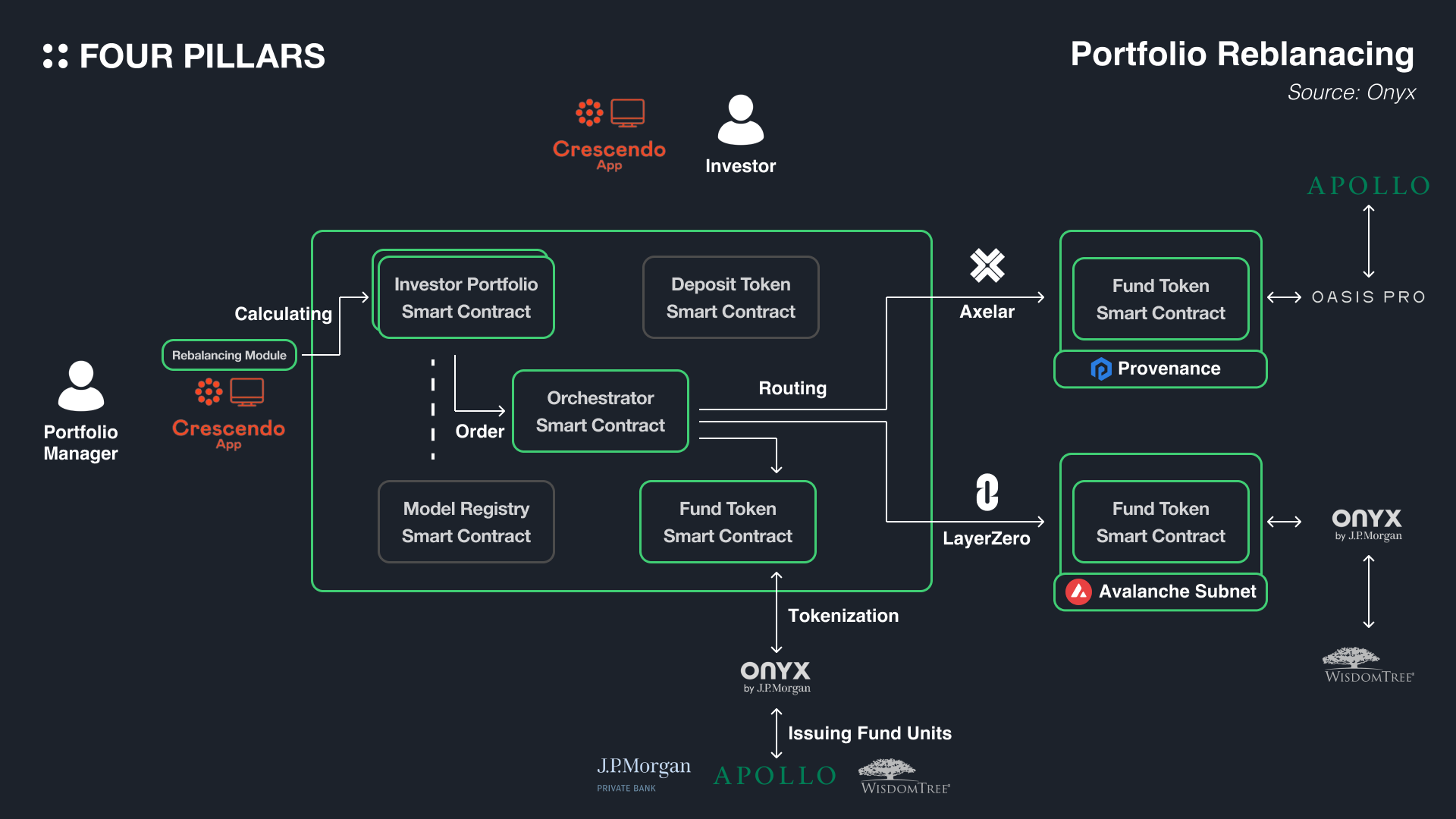 ๊ฐ ๋ธ๋ก์ฒด์ธ ๋คํธ์ํฌ ๋ณ๋ก ์ผ๋ง ๋งํผ์ ํ๋ ํ ํฐ์ ๋งค์ํด์ผํ๋์ง ๊ฒฐ์ ๋๋ฉด, ํฌํธํด๋ฆฌ์ค ๋ฆฌ๋ฐธ๋ฐ์ฑ ๊ณผ์ ์ ์ํ ํ๋ ํ ํฐ ๋งค์ ๊ณผ์ ์ ์ค๋งํธ ์ปจํธ๋ํธ๋ฅผ ํตํด ์๋์ ์ผ๋ก ์ด๋ฃจ์ด์ง๋ค. Onyx Digital Assets์ ์กด์ฌํ๋ Orchestrator Smart Contract๋ ํฌํธํด๋ฆฌ์ค ๋งค๋์ ์ ์ฃผ๋ฌธ์ ๋ฐ์ ๊ฐ ๋คํธ์ํฌ์ ๋งค์/๋งค๋ ์ฃผ๋ฌธ์ ์ ๋ฌํ๋ค. Provenance Blockchain๊ณผ Avalanche Subnet์ ์กด์ฌํ๋ ํ๋ ํ ํฐ์ ์ฃผ๋ฌธ์ ๊ฐ๊ฐ Axelar์ LayerZero ํฌ๋ก์ค์ฒด์ธ ๋ฉ์์ง ํ๋กํ ์ฝ์ด ์ค๊ฐํ๋ค.