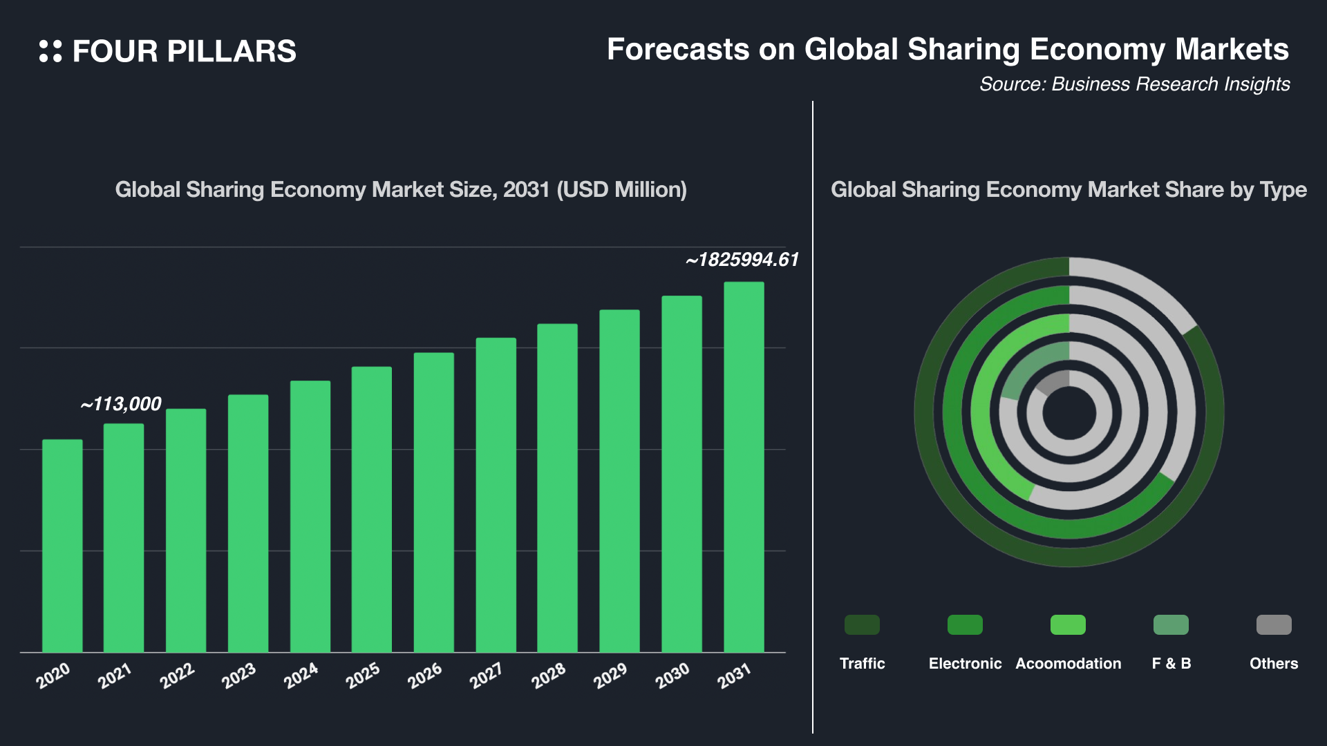 위에서 보았던 것과 같이, 공유경제의 개념이 다양한 산업에 침투하고 성과를 내기 시작하면서 시장의 규모는 급격하게 늘어나게 되었다. Business Research Insights에 따르면, 글로벌 공유경제의 총 규모는 연마다 우상향하여 2031년까지 약 1조 달러 이상을 기록할 것으로 예상된다.