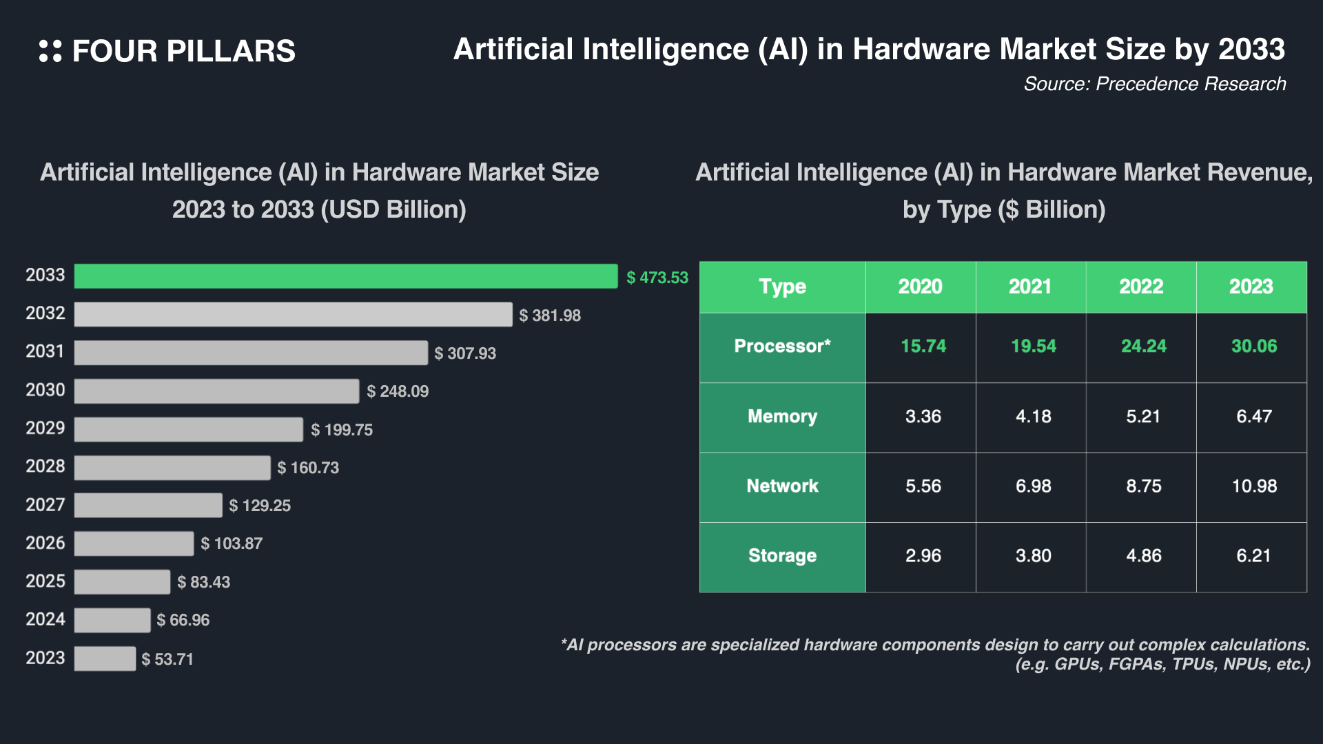 AI 기술의 진보는 특히 GPU와 같은 고성능 컴퓨팅 자원에 대한 수요를 폭발적으로 증가시켰다. Precedence Research에 따르면, 글로벌 AI 하드웨어 시장의 규모는 약 24.3%의 연평균 성장률(CAGR)을 거듭하여 2033년까지 4,735억 3천만 달러를 넘어설 것으로 전망한다.
