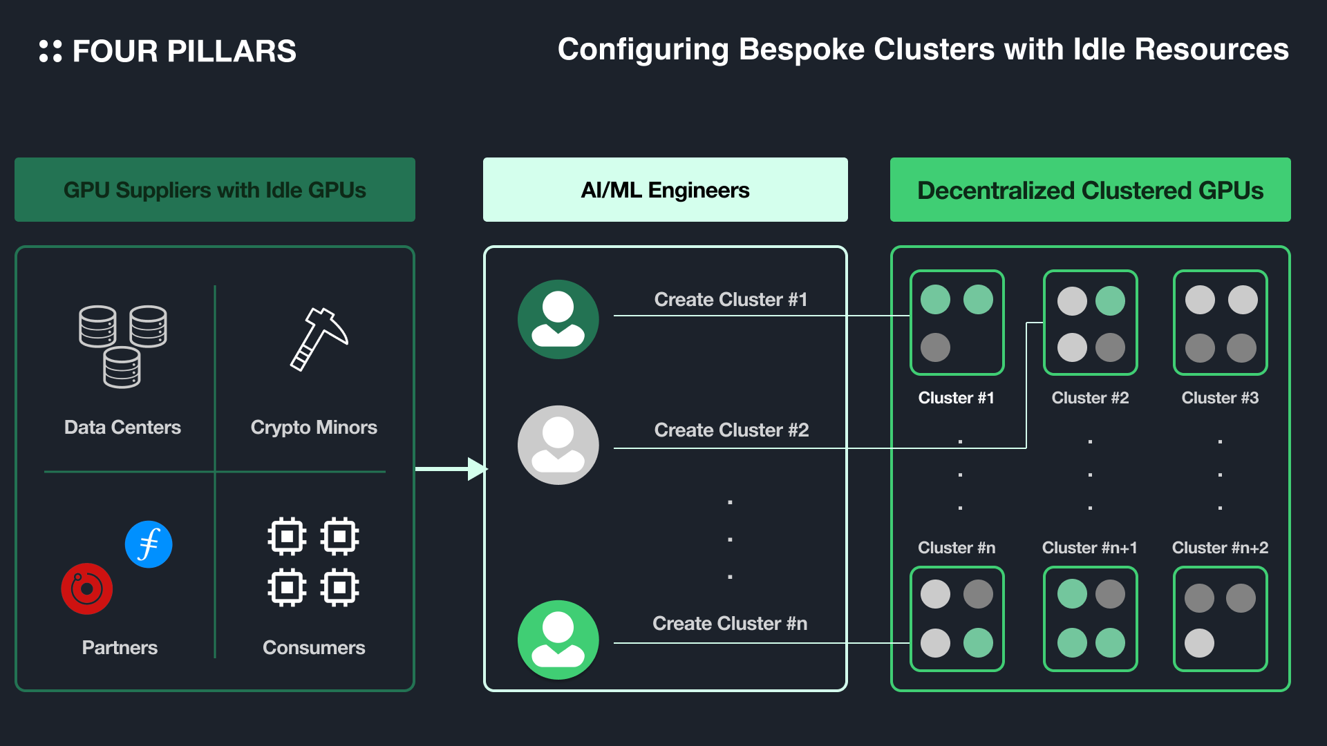 결국 풀어야하는 문제는 어떻게 비용 절감과 일정한 퀄리티를 보장하는 컴퓨팅 자원의 충분한 공급을 동시에 달성할 수 있을까에 관한 것이다. Solana 기반의 오케스트레이션(Orchestration) 레이어인 IO.NET은 데이터 센터와 채굴자, 크립토 프로젝트(e.g., Render Network, Filecoin), 그리고 소비자들의 유휴 컴퓨팅 자원들을 통합하는 방식으로 이를 해결한다 - 컴퓨팅 파워의 공급자들은 자신들의 컴퓨팅 자원들을 제공함으로써 토큰을 보상으로 부여받고, 이용자들은 해당 토큰을 재화로 활용하여 다양한 종류의 유휴 컴퓨팅 자원들로 자신들의 GPU 클러스터를 저렴하게 구성하는 방식이다*.