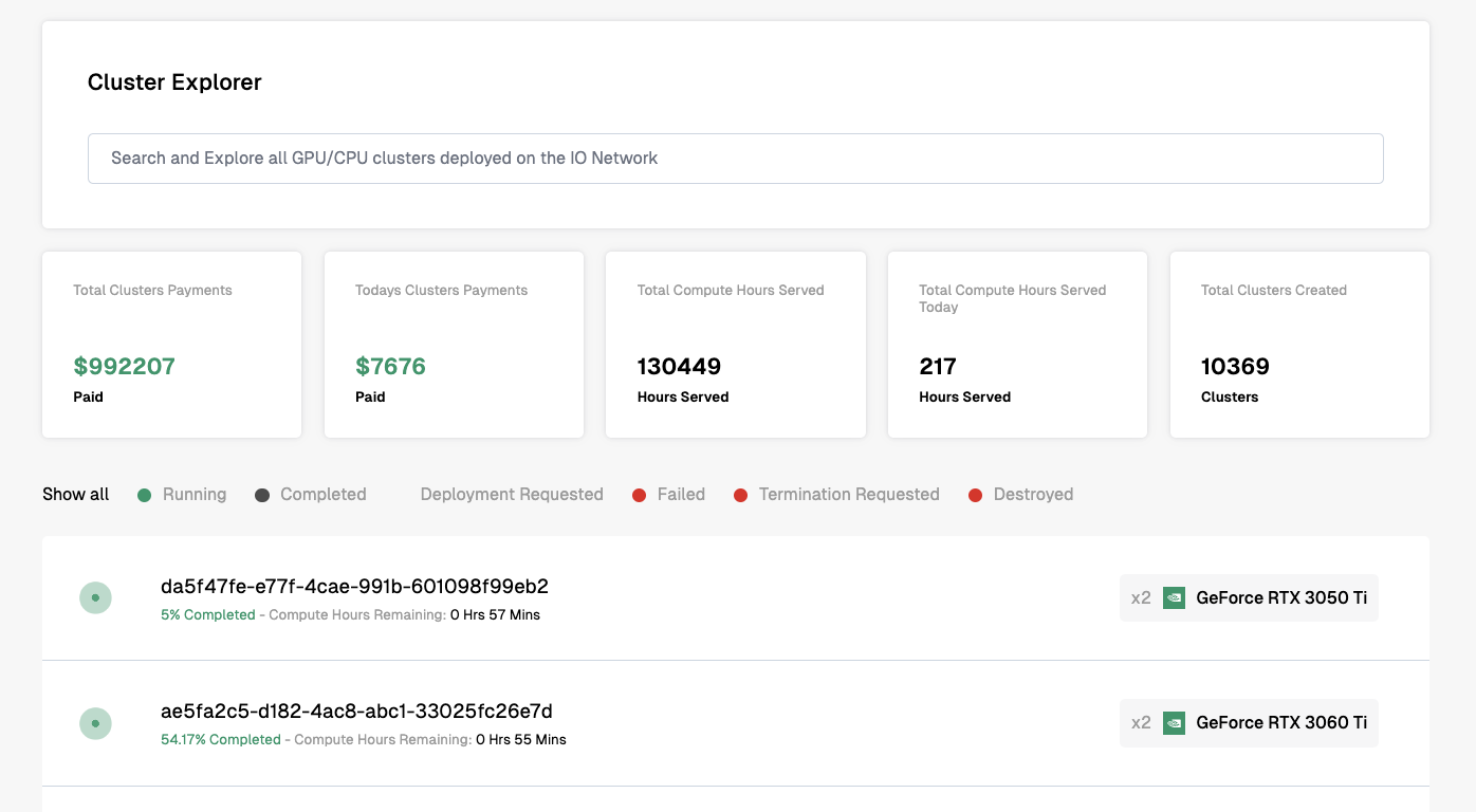 24년 4월 29일 기준으로, 이용자는 약 87개 여개의 국가에 걸쳐 클러스터를 구성할 수 있으며, 모든 공급자들을 통틀어 플랫폼 상에서 총 가용한 GPU의 수는 약 1만개에 육박한다. 하지만 아직까지 IO.NET은 초기 프로젝트임에, GPU를 사용하는 실제 사용자 수는 그리 많지 않다. 대부분의 GPU의 작업 부하는 0%이며, 인기있는 일부 프로세서는 공급이 처음부터 많지 않거나 이미 90% 이상의 공급량이 사용되고 있는 경우가 많았다 (e.g., A100 PCIe 80 GB K8S(NVIDIA), H100 80GB HBM3(NVIDIA), RTX A5000(NVIDIA)). IO Explorer에 따르면, 지금까지 누적 생성된 클러스터의 수는 약 10369 여 개이며 이들로부터 약 99만 불에 해당하는 지불이 이뤄졌다.