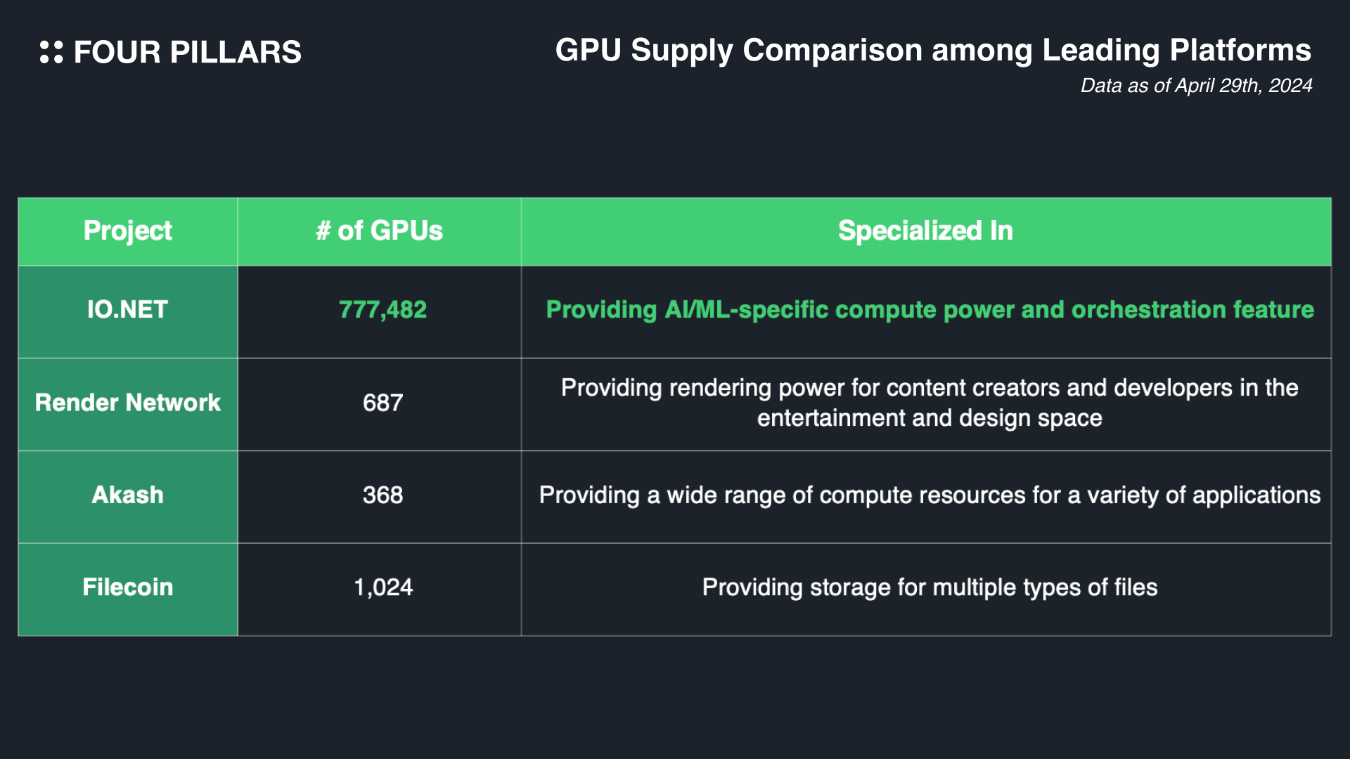 사실, IO.NET이 Web3 시장에서 유일한 컴퓨팅 자원 공급을 위한 프로젝트는 아니며, IO.NET 이외에도 Akash, Render Network, Filecoin 등 다양한 프로젝트들이 함께 이 영역을 선두하고 있다. 하지만 앞서 언급한 바와 같이, 이 프로젝트들에 비해 IO.NET이 가지는 경쟁우위는 AI/ML에 특화된 컴퓨팅 연산능력을 제공한다는 점 및 단일 인스턴싱 대신 클러스터링을 도입한다는 점이다 - 클러스터링은 여러 GPU가 서로 연결되어있으므로 컴퓨팅 자원을 동적으로 할당하고 워크로드를 분산시키는데 최적화할 수 있다는 장점이 있다.