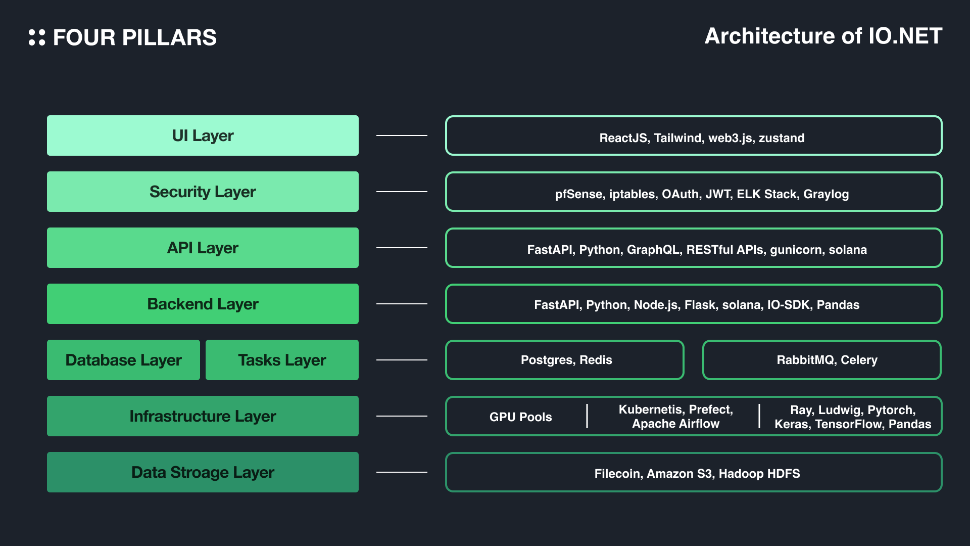 IO.NET의 아키텍처는 각각 고유한 기능을 최적화하여 수행하는 여러 레이어로 구성되어있는 모듈식 아키텍처를 채택하고 있다. 아래에 나열된 레이어 별 기술 스택 이외에도, IO.NET는 Reverse Tunnels, 그리고 Mesh VPN Networks를 채택하여 엔지니어들이 데이터에 쉽게 접근하고 그것들을 안전하고 원활하게 제어될 수 있도록 한다.