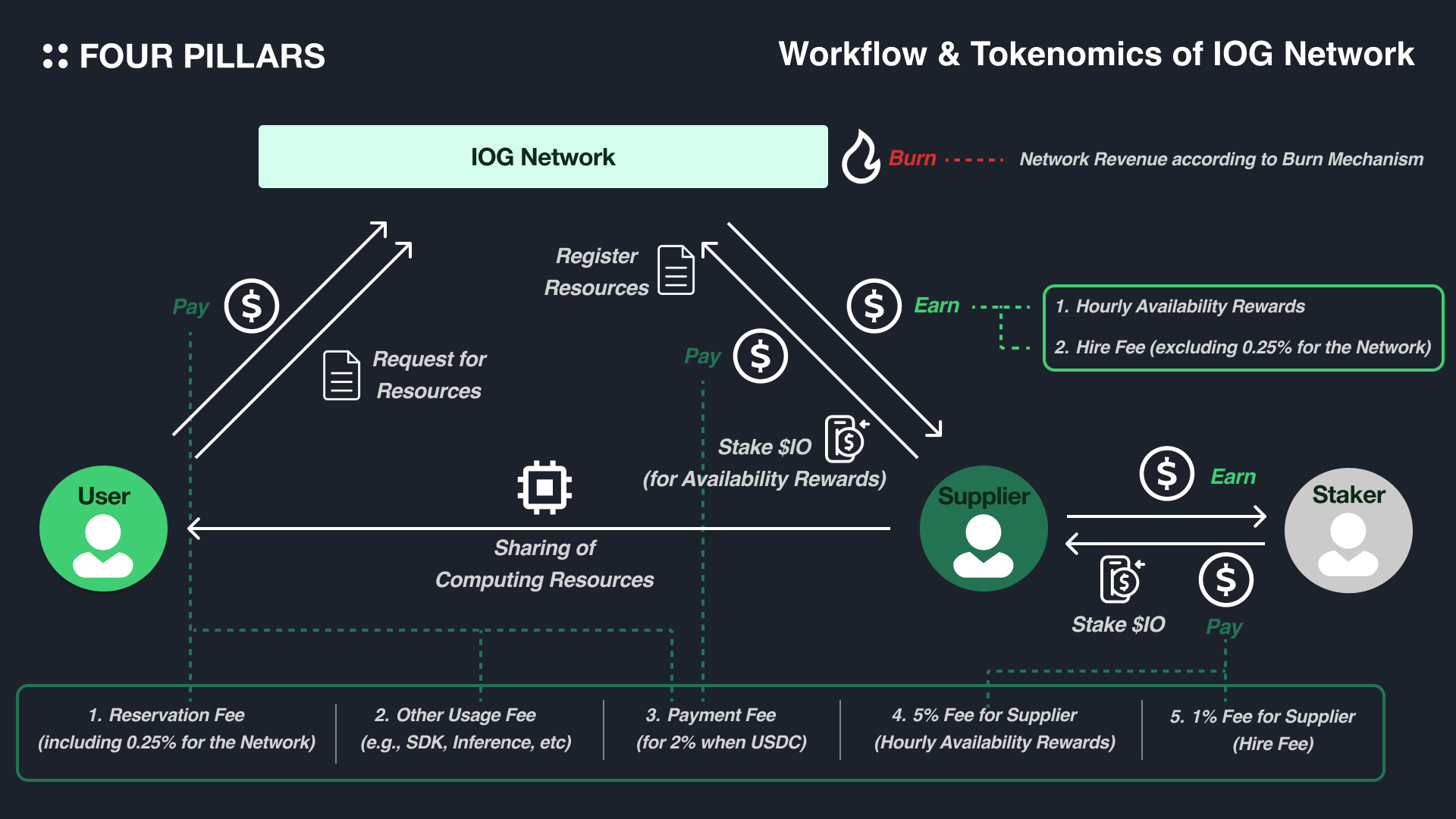 $IO 토큰은 서비스 이용자가 IO.NET을 통해 GPU 클러스터 예약할 때 뿐만 아니라 IOG 네트워크 상에서 SDK를 활용하여 호스팅/배포되는 다양한 종류의 어플리케이션(혹은 인스턴스들)에 대한 구축 및 여러 추론 모델들을 활용할 때에도 사용될 수 있다. GPU가 예약 혹은 고용될 때는 0.25%의 수수료가 네트워크에 의해 징수되며, 예약이 된 노드의 성능 및 가동 시간에 따라 슬래싱 조건을 검토한 후 공급자에게 보상이 지급된다 - IOG 네트워크에서는 이 보상을 ‘고용 수수료(Hire Fee or Hire Rate)’ 라고 한다. 만일 공급자가 $IO 토큰 보유자로부터 스테이킹을 받은 경우 해당 보상의 1%를 스테이커에게 돌려준다.
