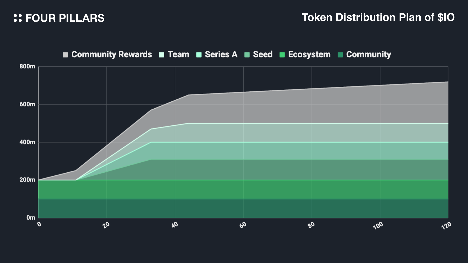 $IO의 총 고정 발행량 8억개 중 5억개가 초기 유통량이며 나머지 3억개는 공급자와 스테이커들에게 분배된다(i.e., Community Rewards) - 이 Community Rewards는 첫해 8%에서 시작하여 8억 개의 $IO 한도에 도달할 때까지 약 20년간 월 1.02%(연간 ~12%)수준으로 감소하는 Deflationary 모델을 따른다.