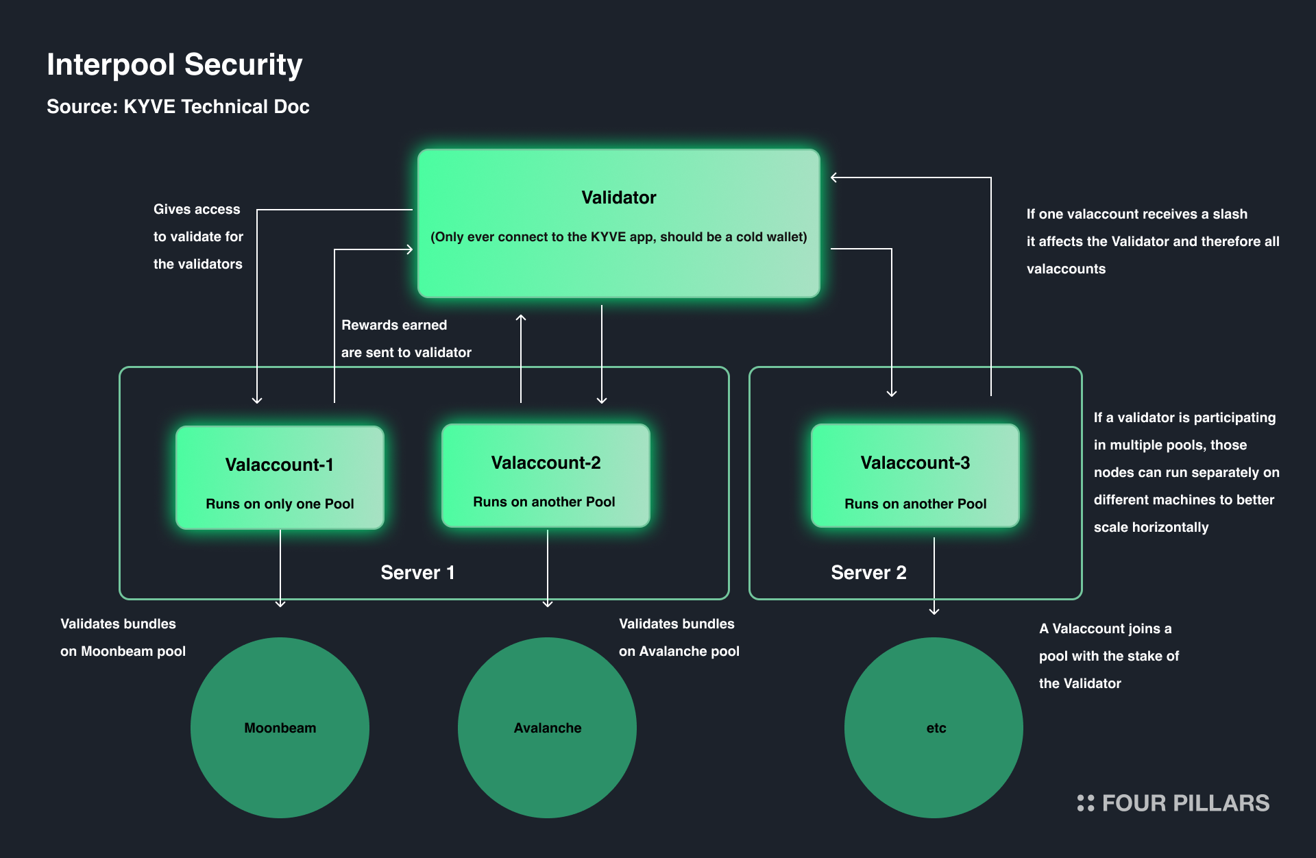 이것을 가능하게 하기 위해서는, 새로운 개념을 추가해야만 했는데, Valaccounts가 바로 그것이다. 벨리데이터들은 각각의 valaccount에 검증을 할 수 있는 일종의 권한을 부여하여 프라이빗 키나 메모닉을 건내주지 않고도 다양한 각각의 풀을 관리할 수 있도록 설계하였기 때문에 안전하게 데이터 풀을 여러개 운영할 수 있게 된다. 이를 통해 카이브는 데이터 풀의 보안성을 높히고, 벨리데이터와 스테이커는 수익을 창출할 수 있는 윈윈 상황을 만들 수 있다.
