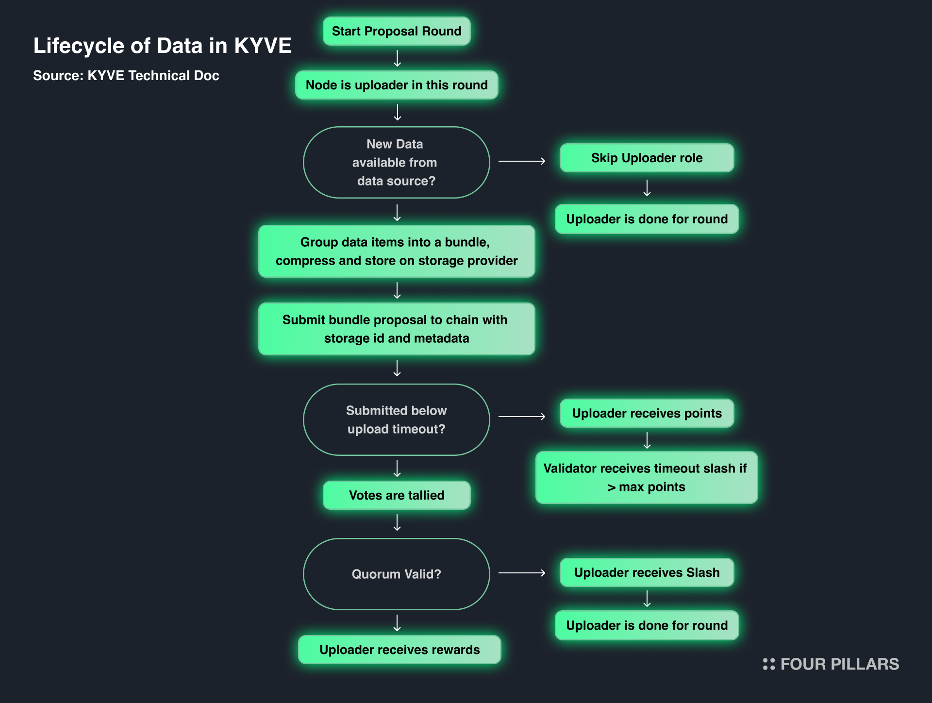 카이브는 이러한 작업을 통해 데이터들을 계속해서 가져오기 보단, 각각 번들을 라운드마다 제출해서 효율적인 데이터 전달,저장 작업을 가능하게한다. 각각의 라운드마다 하나의 번들이 제시되고, 해당 번들에는 다양한 출처에서 넘어온 데이터들이 들어있다고 볼 수 있다. 데이터의 번들들이 최종적으로 제출되는 곳은 바로 위에서 설명된 데이터 풀이고, 해당 번들을 벨리데이터들이 검증하게된다.