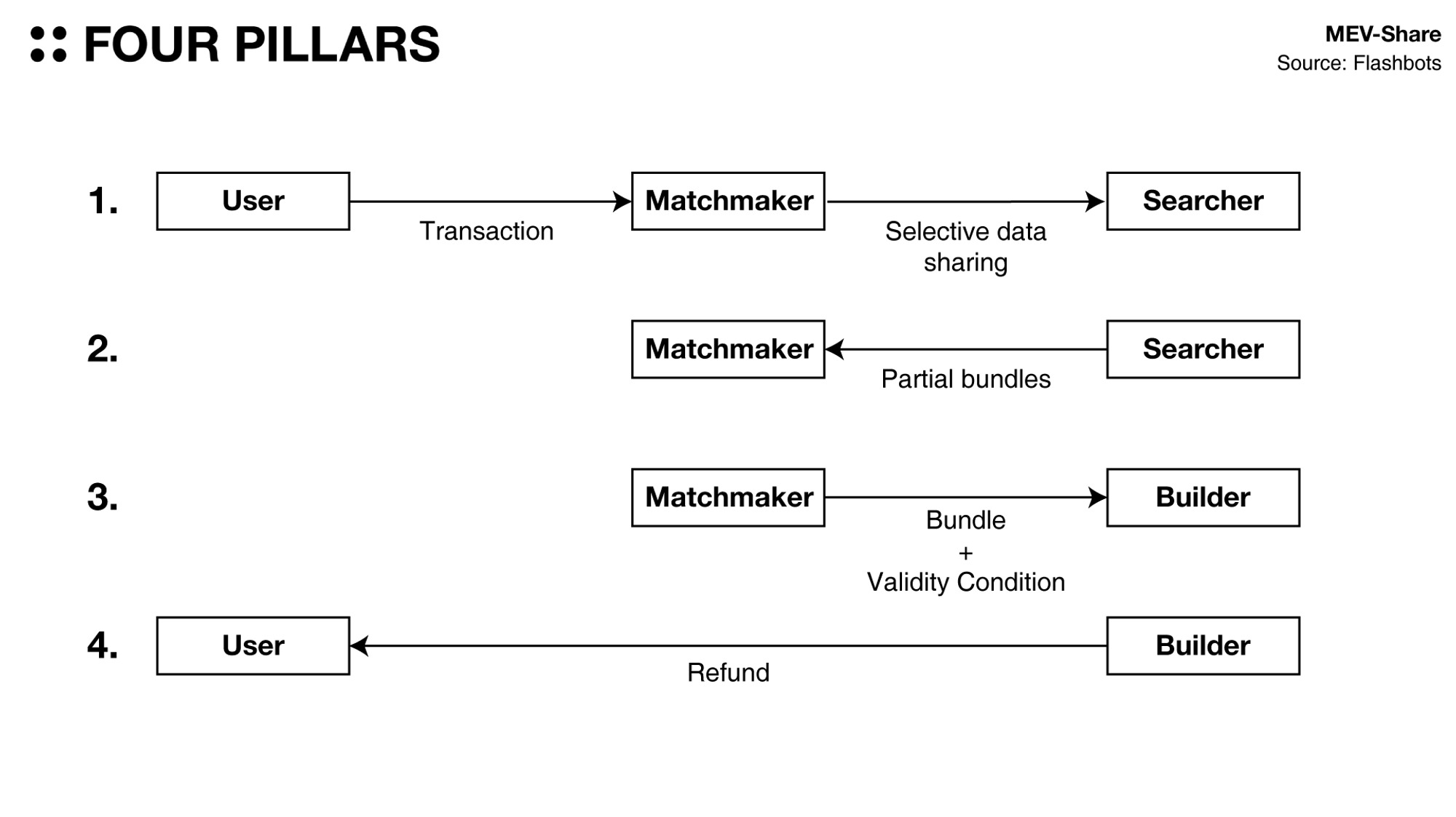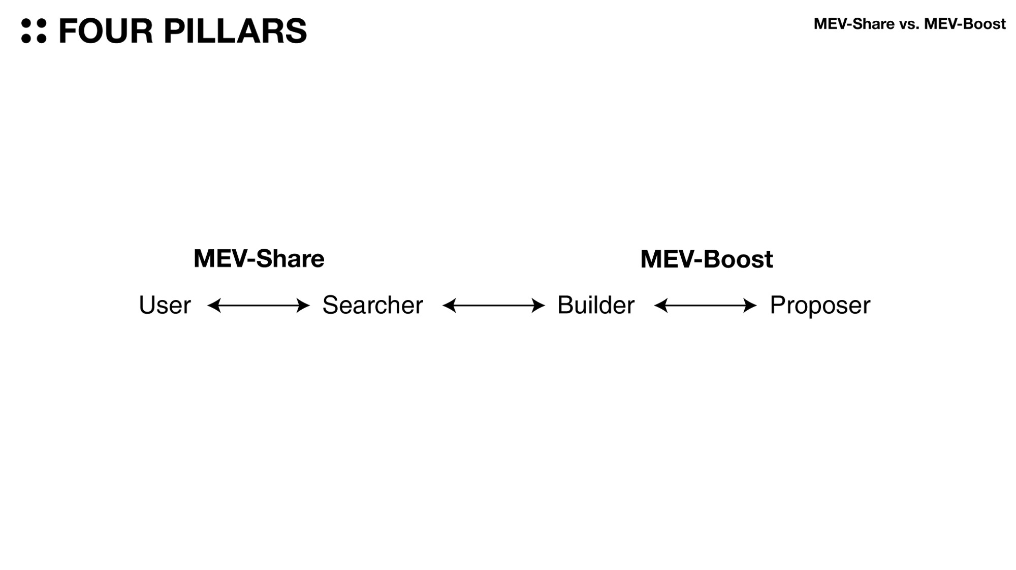 MEV-Boost와 MEV-Share는 이러한 다양한 주체들 사이에서 공정한 MEV 분배를 목적으로, 각 주체들 간의 상호작용을 정의한 프로토콜로 이해할 수 있다. MEV-Boost에서는 Validator와 Builder의 관계에 초점을 맞추어 서로 악의적인 행동을 하지 못하게 막는 목적이 강했다면, MEV-Share에서는 이와 더불어 Searcher와 User간의 관계에 관한 로직을 추가한 것으로 이해할 수 있다. MEV-Share는 MEV-Boost 와 별개의 프로토콜이 아닌, MEV-Boost를 한 단계 발전시키고자 하는 시도이다.
