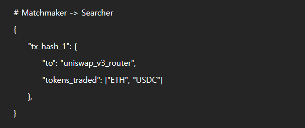 User가 자신의 트랜잭션을 Matchmaker에게 보내는데, Matchmaker는 Searcher들에게 User의 트랜잭션에 대한 정보 중 일부만을 공유한다. 예를 들어, 아래 json 형태와 같이 트랜잭션의 내용을 전부 공개하는 대신, 트랜잭션이 Uniswap V3 컨트랙트를 호출했고, ETH와 USDC 토큰을 거래한다는 정보만 선택해서 보내는 것이다.