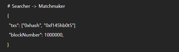 아래 json 데이터를 예시로 들면, 유저의 특정 트랜잭션인 “0xhash” 뒤에 Searcher 자신이 직접 만든 MEV 트랜잭션인 “0xf145bh0t5” 를 묶어서 “txs” 필드의 bundle로 지정한 후, Matchmaker 에게 보내게 된다.