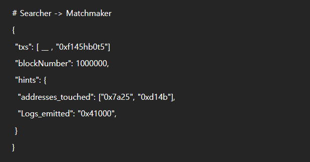 아래 Searcher가 Matchmaker에게 보내는 json 데이터의 예시를 보자. bundle의 앞이 “” **로 되어있는 것은, 아래 조건에 맞는 트랜잭션이 있으면 이 위치에 넣어달라는 의미이다. hints 필드에 있는 데이터들이 Searcher가 요구하는 조건이다. User의 트랜잭션을 실행시켰을 때, “0x7a25”와 “0xd14b” 컨트랙트와 상호작용하고, “0x41000”이라는 이벤트 로그가 발생한 트랜잭션이면 “” 필드에 들어가야 한다는 것이다.