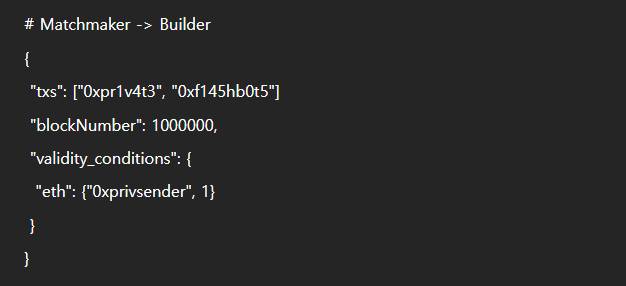 아래 예시의 validity condition에 따르면 Builder는 0xprivsender라는 user에게 1 ETH을 보내야 한다는 것이다. Builder 또한 신뢰주체로 가정해서 선의로 validity condition을 지켜 User에게 보내주게 된다. User는 이러한 과정을 통해 자신의 트랜잭션이 bundle에 섞여 MEV 가 창출되었을 때 그 일부를 보상받을 수 있다는 것이고, 이것이 MEV-Share가 나오게 된 주된 목적이다.