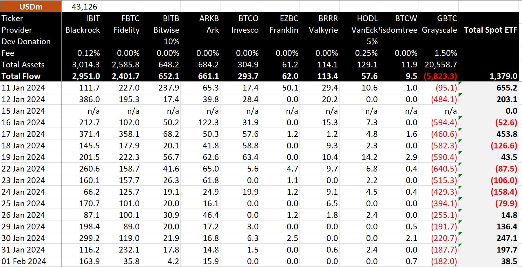 2024년 1월 11일, BTC 현물 ETF들의 거래가 처음으로 시작되었다. 첫날 무려 $4.6B의 거래량을 기록하며 순조로운 시작을 했다. 하지만, 둘째날부터 GBTC의 매도 물량이 지속적으로 쏟아지면서 오히려 ETF net flow가 마이너스를 기록할 때도 있었다. 이는 1) 기존 마이너스 프리미엄으로 GBTC를 저렴하게 매수한 홀더들의 매도 압력과 2) 높은 운용 수수료(1.5%)로 인한 다른 ETF로의 전환 압력때문이다. 1달 동안 약 $5.8B의 GBTC가 매도되었고, 아직 $20.6B의 GBTC가 남아있다. 이는 나머지 BTC 현물 ETF를 합친것에 비해 약 2.7배나 큰 수치이다. 긍정적인 사실은 1월 22일부터 GBTC의 매도량이 점점 떨어지는 추세를 보이고 있다. 이에 따라 최근 BTC 현물 ETF로의 net inflow는 플러스로 전환되었으며, 시장에 긍정적인 시그널로 작용하고 있다.