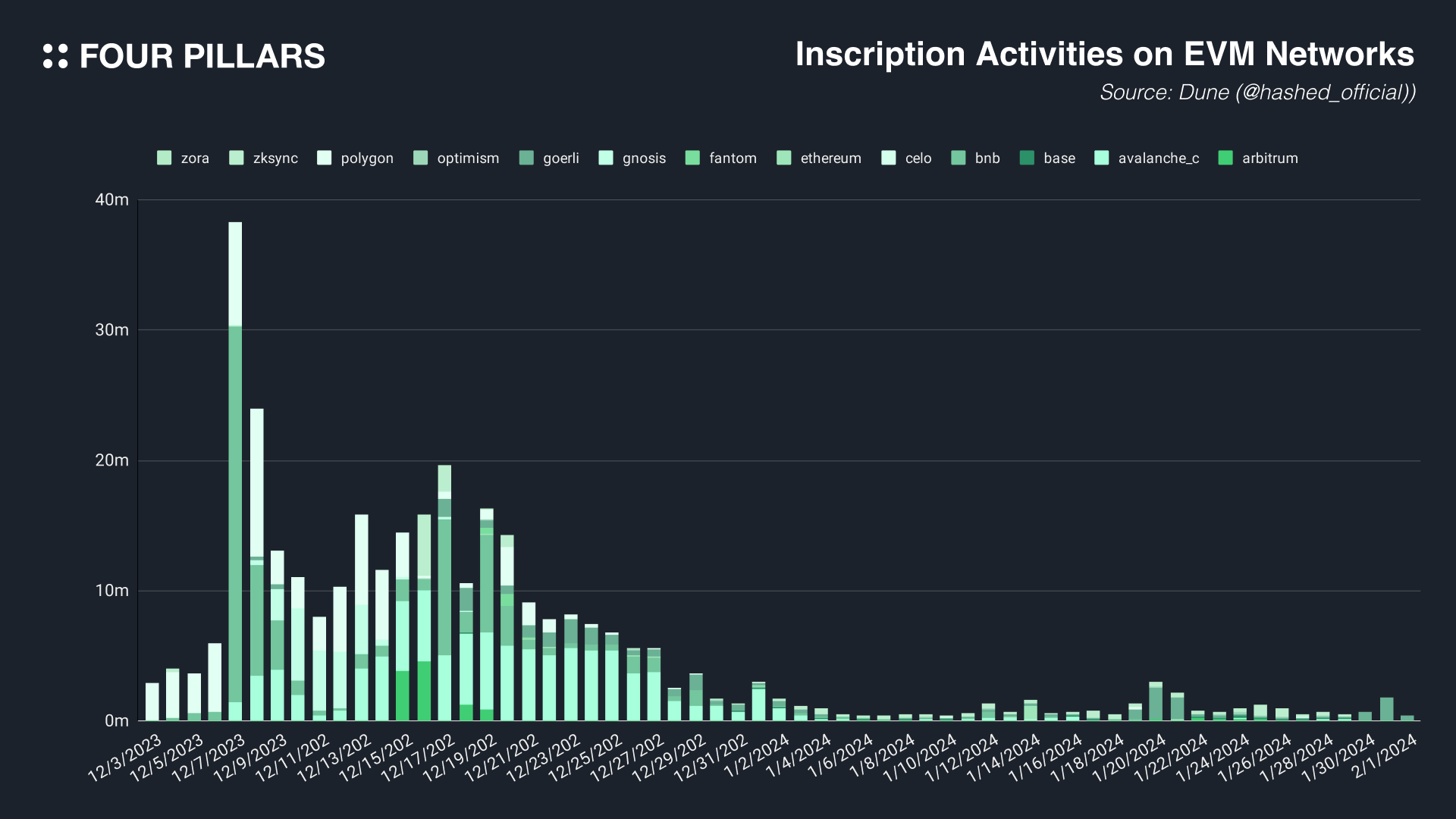 인스크립션은 블록체인 네트워크의 특정 저장 공간에 텍스트를 기록하는 활동으로 비트코인 네트워크에서 시작되어 다른 네트워크들에 전염병같이 퍼져나갔다. 하지만, 작년 12월과 달리 1월에는 EVM 네트워크에서의 인스크립션 활동이 매우 저조했다. 이에는 몇 가지 이유가 존재하는데, 첫 번째로 EVM 네트워크들은 비트코인 네트워크와 달리 기본적으로 토큰 표준을 가지고 있다. 따라서 BRC-20 토큰이 가졌던 파급력에 비해 인기가 금방 식었다. 두 번째로 부족한 인프라이다. 지속적으로 인스크립션 및 BRC-20 토큰과 관련되어 인프라가 구축되고 있는 비트코인 네트워크와 달리, EVM 네트워크에는 인스크립션 관련 인프라 빌딩이 거의 되지 않았으며, 심지어 마켓플레이스조차 없는 경우도 있었다. 이에 반해 비트코인 네트워크에선 아직도 인스크립션 관련 활동량이 굉장히 많으며, 생태계도 빠르게 성장하고 있다. 앞으로 인스크립션 활동은 네트워크 효과가 이미 구축된 비트코인 네트워크에서만 유의미하게 일어날 것으로 예상된다.