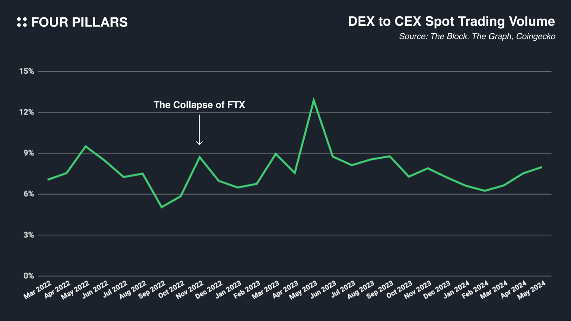 이는 트레이더들에게 있어 DEX의 거래경험이 현저히 낮아 이용하지 않게 되었거나, 혹은 보안이나 투명성과 같은 요소보다도 가격 발견과 자본 효율성 등의 측면에서 이미 익숙하거나 더욱 편리한 거래 경험을 결국에는 더욱 선호한다는 것을 시사한다.