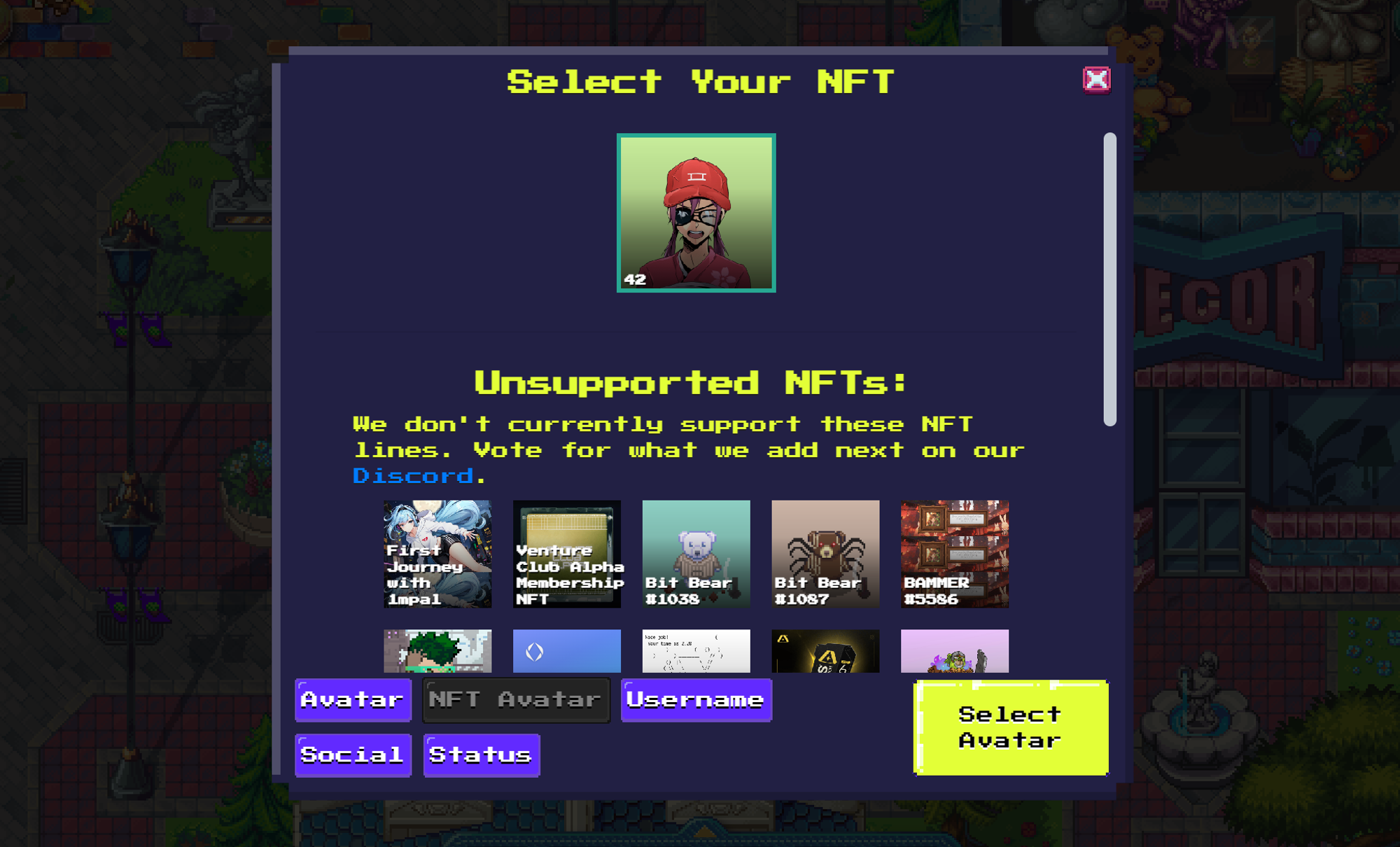 Pixels๋ 50๊ฐ์ NFT ์ปค๋ฎค๋ํฐ๋ค๊ณผ์ ํ์ ์ ํตํด์, ํด๋น NFT๋ฅผ Pixels๋ด์์ ์ฌ์ฉํ ์ ์๋๋ก ํ๋ค. ํธํ๋๋ NFT ์ปฌ๋ ์ ๋ฆฌ์คํธ๋ ์ฌ๊ธฐ์์ ํ์ธํ ์ ์๋ค. ๋์ ๊ฒฝ์ฐ, ๊ฐ์ง๊ณ ์๋ Timeless NFT๋ฅผ Pixels ๋ด์์ ์ฌ์ฉํ์๋ค.