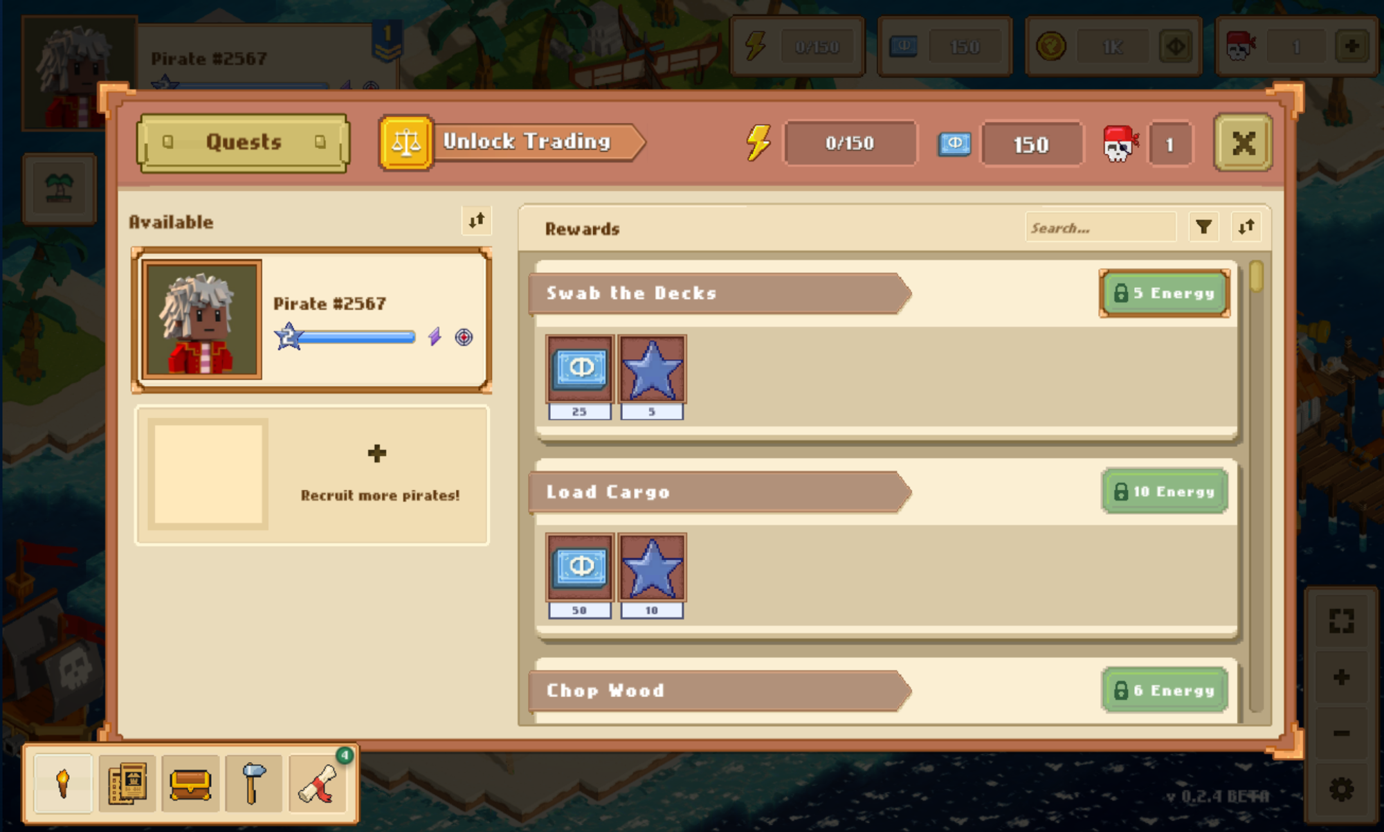 Pirate Nation์ ๋ธ๋ผ์ฐ์ ๊ธฐ๋ฐ์ RPG ๊ฒ์์ผ๋ก, ํ๋ ์ด์ด๋ค์ ๋ฐ๋ค์ ์ฌ์ ํํํ๋ฉด์ ํ์คํธ๋ฅผ ์๋ฃํ๊ณ , ๋ณธ๊ฒฉ์ ์ธ ํด์ ์ ์ธ๊ณ๋ฅผ ๊ฒฝํํ๊ฒ ๋๋ค. ๋ชจ๋ ๋ก์ง์ด ์จ์ฒด์ธ์ ๊ตฌํ๋์ด ์๋ Fully Onchain Game์ด๊ณ , ํด์ NFT๋ค์ ์ด๋๋ฆฌ์ ์์ ์กด์ฌํ์ง๋ง, ๊ฒ์ํ๋ ์ด๋ ์๋นํธ๋ผ ๋ ธ๋ฐ์์ ์งํ๋๋ค. ํ์ฌ๋ Pirate Nation์ NFT๊ฐ ์๊ฑฐ๋, ์ด๋ ์ฝ๋๊ฐ ์์ด์ผ์ง๋ง ํ๋ ์ดํ ์ ์๋๋ฐ, ๊ณง F2P๋ ์ง์ํ ๊ฒ์ผ๋ก ์์๋๋ค.
