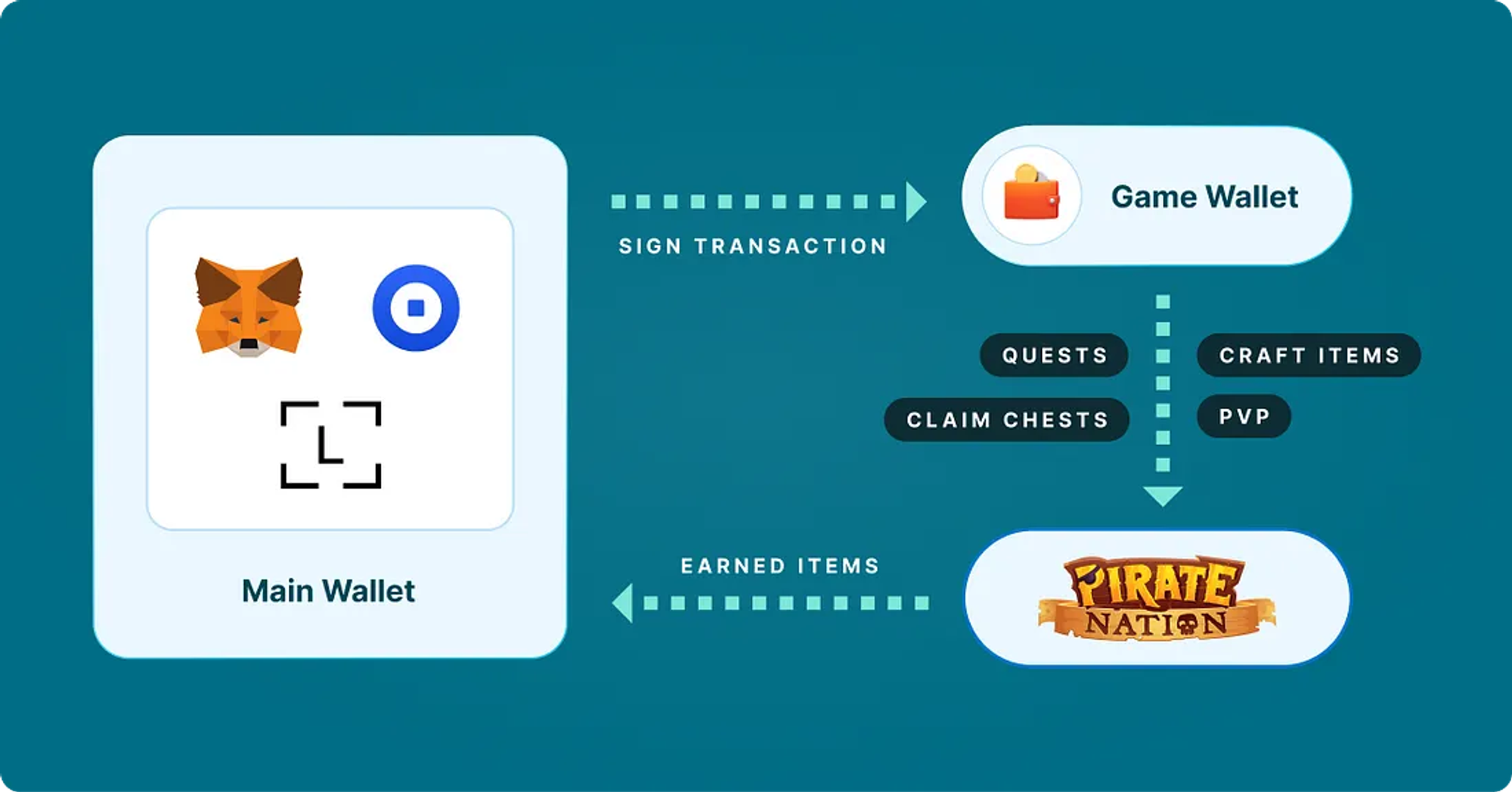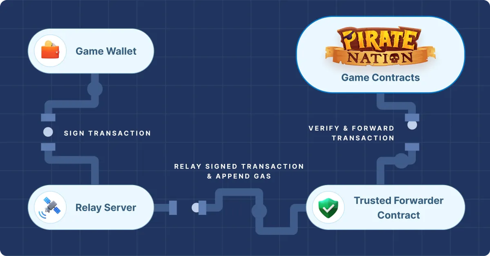Proof of Play๋ ์์ฒด ์ง๊ฐ ์๋ฃจ์ ์ธ Game Wallet์ ํตํด์ ํ๋ ์ด์ด๋ค์ด ์ธ๊ฒ์ ๋ด์ ์ก์ ์ ๋ณ๋์ ์์๋ฃ๋ ์๋ช ์์ด ํ๋ฝํ ์ ์๋๋ก ํ๋ค. ์ ์ ๋ค์ Pirate Nation์ ์ ์ํ ๋์, ํด๋น ๊ฒ์์๋ ์ ๊ธฐ์กด ์ง๊ฐ์ ๋์ ํ์ฌ ๊ฑฐ๋๋ฅผ ์ํํ ์ ์๋ ๊ถํ์ ๋ถํ๋ค๋ ๋ฉ์์ง์ ์๋ช ์ ํ๊ฒ ๋๋ค. ๋ํ, EIP-2771์ ๋์ ํ์ฌ์ ํ๋ ์ด์ด์ ํธ๋์ ์ ์ด ๋ธ๋ก์ฒด์ธ์ด ์๋ API ์๋ฒ๋ก ๋ณด๋ด๊ฒ ํด์, Pirate Nation์ด ๋์ ์์๋ฃ๋ฅผ ์ง๋ถํ ์ ์๋๋ก ํ๋ค.