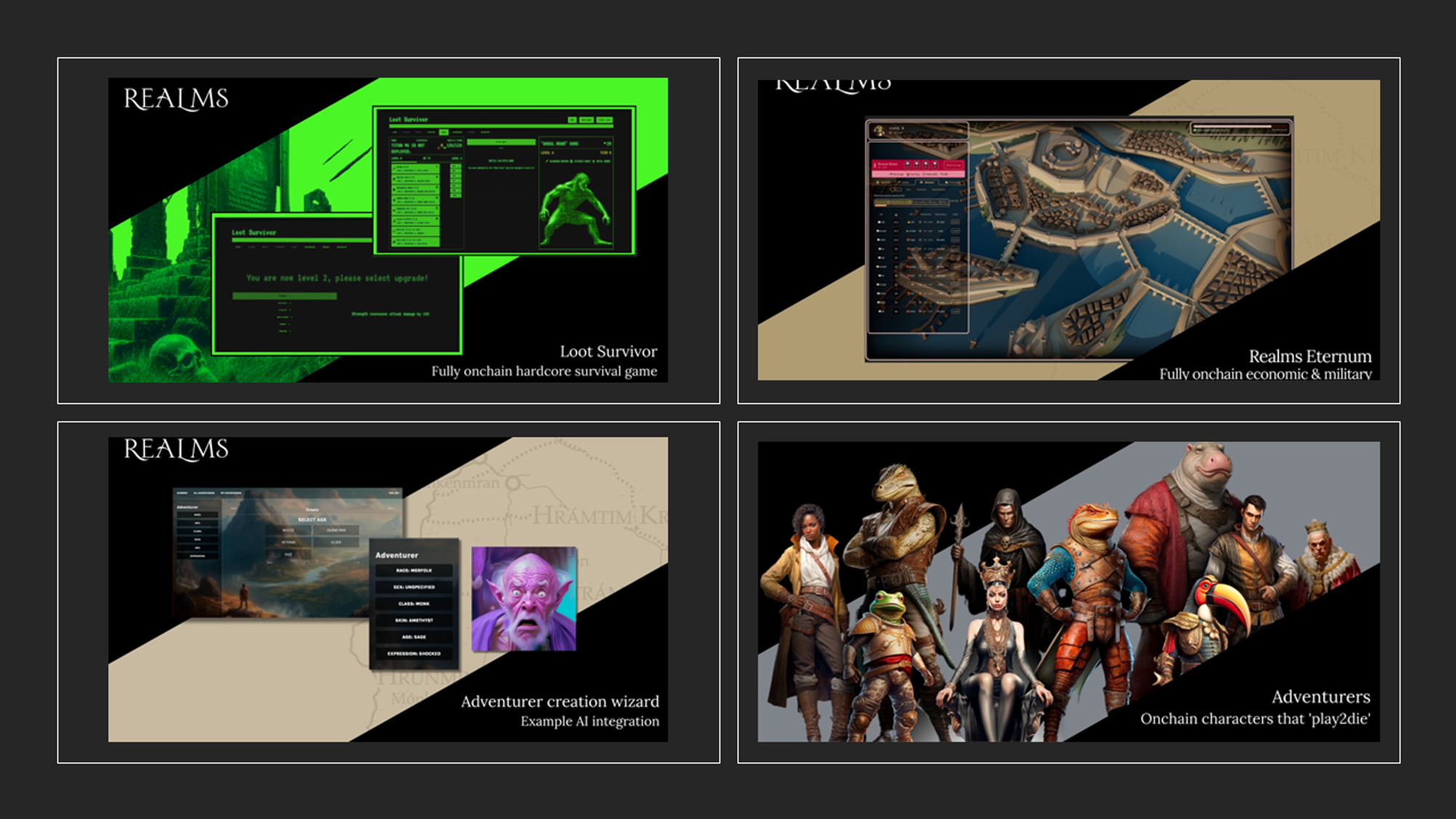 Loot Survivor๋ Bibliotheca DAO์ Loothero์ ์ํด์ ๋ง๋ค์ด์ก๋ค. Bibliotheca DAO๋ Loot์ ํ์ํ๋ก์ ํธ์ธ Loot Realms NFT๋ฅผ ๋ฐํ์ผ๋ก ๋ง๋ค์ด์ง ์ปค๋ฎค๋ํฐ ๋ฐ ์ํ๊ณ ํ๋ก์ ํธ์ด๋ค. Bibliotheca DAO์ ๊ถ๊ทน์ ์ธ ๋ชฉํ๋ ์ด Realms๋ฅผ ๋ฐํ์ผ๋ก Autonomous World๋ฅผ ๋ง๋ค์ด๋๊ฐ๋ ๊ฒ์ด๊ณ , ์ด๋ฅผ ์ํด์ Loot Survivor๋ฅผ ํฌํจํ ์ฌ๋ฌ ํ๋ก์ ํธ๋ค์ ์ค๋น ์ค์ด๋ค. ๋จผ์ Realms Eternum์ ์ ๋ต ๊ฒ์์ผ๋ก ์ญ์ Fully Onchain Game์ผ๋ก ์คํํฌ๋ท ์์์ ๋ฐฐํฌ๋ ์์ ์ด๋ค. Adventures๋ Bibliotheca DAO์ ๋ค์ดํฐ๋ธ ํ ํฐ์ธ $Lords๋ก ๋ฏผํ ์ด ๊ฐ๋ฅํ ์จ์ฒด์ธ ์บ๋ฆญํฐ๋ค๋ก ์ํ๊ณ ์ ๋ฐ์์ ์ฌ์ฉ๋ ๊ฒ์ผ๋ก ๋ณด์ธ๋ค.