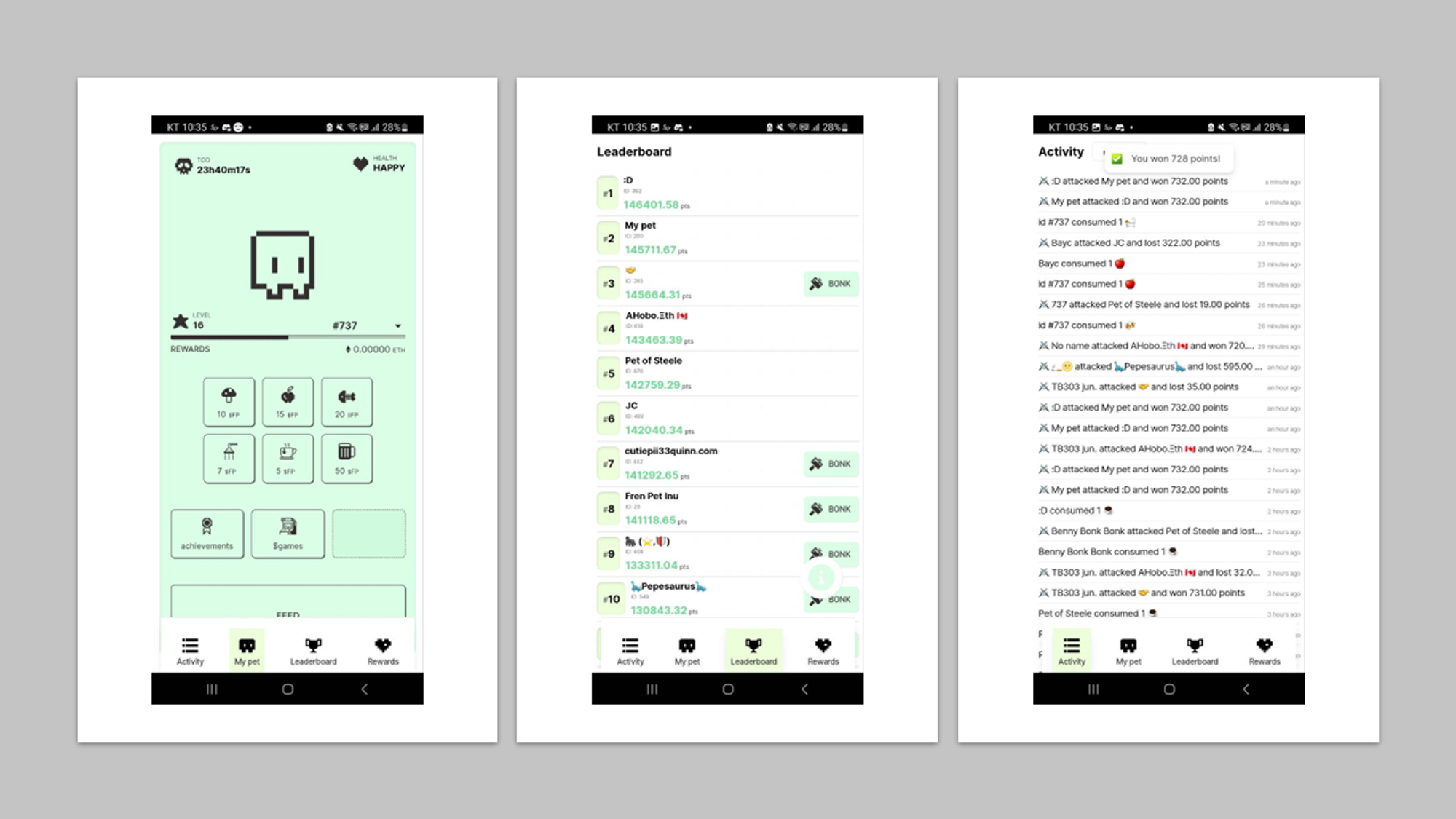 Frenpet์ ํ๋ ์ดํ๊ธฐ ์ํด์ ๋จผ์ ๋์ ํซ์ ๋ฏผํ ํด์ผํ๋ค.๊ฐ ํซ๋ค์ ๋ํ ๋์น ์ฅ์ ์ด ์ฝ 10๋ถ๊ฐ ์งํ๋๋ฉฐ, ๊ฐ๊ฒฉ์ 2000 $FP์์ 100 $FP์ ์ข ๋ฃ๋๋ค. ํซ์ ๋ฏผํ ํ์๋ค๋ฉด, ์ด์ ์ด ํซ์ด ๊ณ์ ์ด์๋จ์ ์ ์๋๋ก ๊ด๋ฆฌํด์ค์ผ ํ๋ค. Frenpet์๋ TOD, Time of Death๋ผ๋ ๊ฒ์ด ์กด์ฌํ๋๋ฐ, ๋ง ๊ทธ๋๋ก ํซ์ด ์ฃฝ๋ ์๊ฐ์ ๋งํ๋ค. ํซ์ด ์ฃฝ์ผ๋ฉด ํด๋น NFT๋ ์๊ฐ๋๋ค. ๋์ ํซ์ด TOD์ ๋๋ฌํ๋ ๊ฒ์ ๋ง๊ธฐ ์ํด์ ๋ค์ํ ๋จน์ด๋ฅผ ์ ๊ณตํ ์ ์๊ณ , ์ด๋ $FP๋ฅผ ํตํด์ ๊ฐ๋ฅํ๋ค. ์ด๋ฌํ ๋จน์ด๋ฅผ ์ค ๋๋ง๋ค TOD๊ฐ ์ฐ์ฅ๋๋ ๊ฒ๊ณผ ํจ๊ป ํฌ์ธํธ๋ ์ฆ๊ฐํ๋ค. ์ด ํฌ์ธํธ์ ๋ฐ๋ผ์ ๋ฆฌ๋๋ณด๋ ์์๊ฐ ์ ํด์ง๋๋ฐ, ์ด ๋ฆฌ๋๋ณด๋๋ ํ์ ์ค๋ช ํ ๋ณด์๊ณผ ๊ด๋ จ์ด ์๋ค.