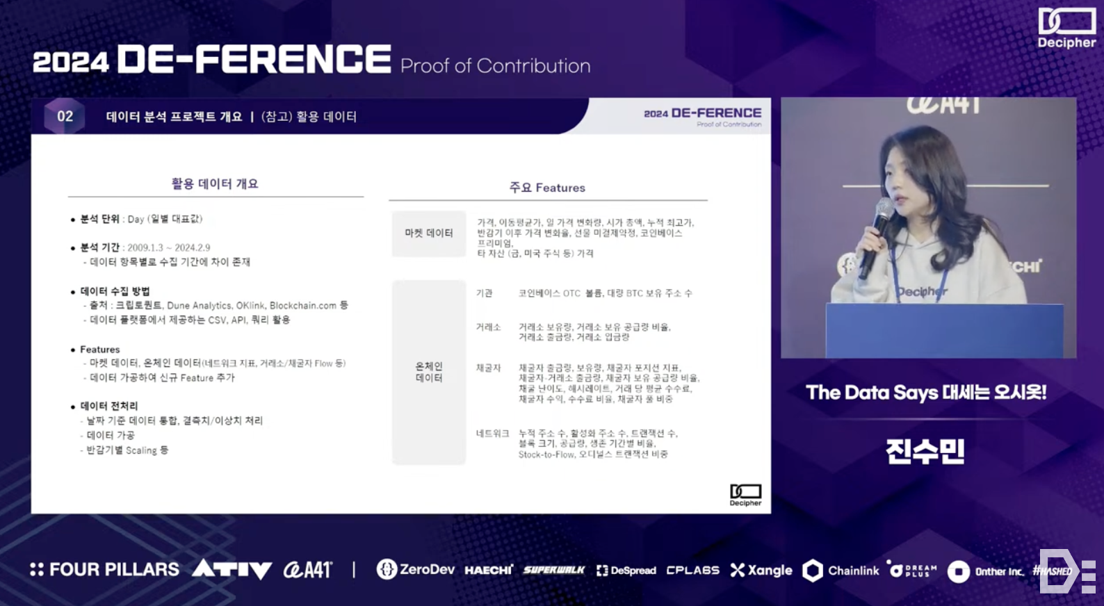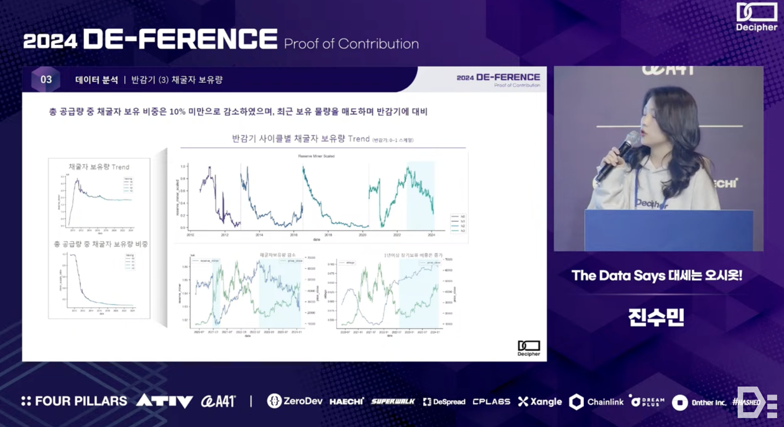 오시옷 팀의 Sumin Jin(진수민)은 디지털 자산 혹은 가치 저장 수단으로서 주목을 받고 있는 비트코인의 지속가능성을 탐구하기 위하여 온체인 데이터, 그리고 여러 오프체인 데이터들을 혼합하여 분석한 결과를 공유하였다. 조금 더 구체적으로는 - 그간의 반감기 사이클동안 비트코인의 가격, 해시레이트, 채굴자 풀의 다이나믹스 등의 패턴을 관찰하였고, 네트워크의 지속 가능성이 지금 수준 이상으로 유지되기 위해 거래 수수료와 비트코인 가격이 어떻게 상호 보완적으로 구성되어야 하는지 시뮬레이션 모델링을 통해 정량적으로 밝혀냈다.