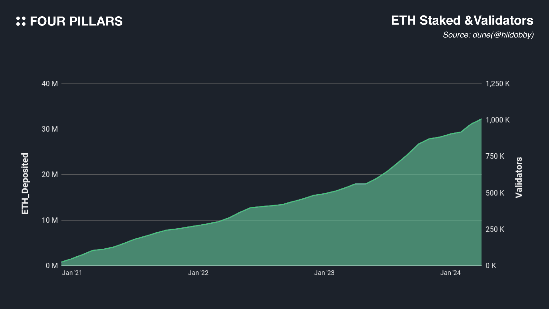 2024년 4월 5일 기준으로, 이더리움의 검증인 수는 약 1백만 명에 육박하며, 스테이킹된 ETH는 3200만개 이상이다 - 이는 이더리움의 전체 발행량 중 약 26.8%에 해당한다. 또한, ETH를 스테이킹하는 사용자 수는 지속적으로 증가하는 추세이다.