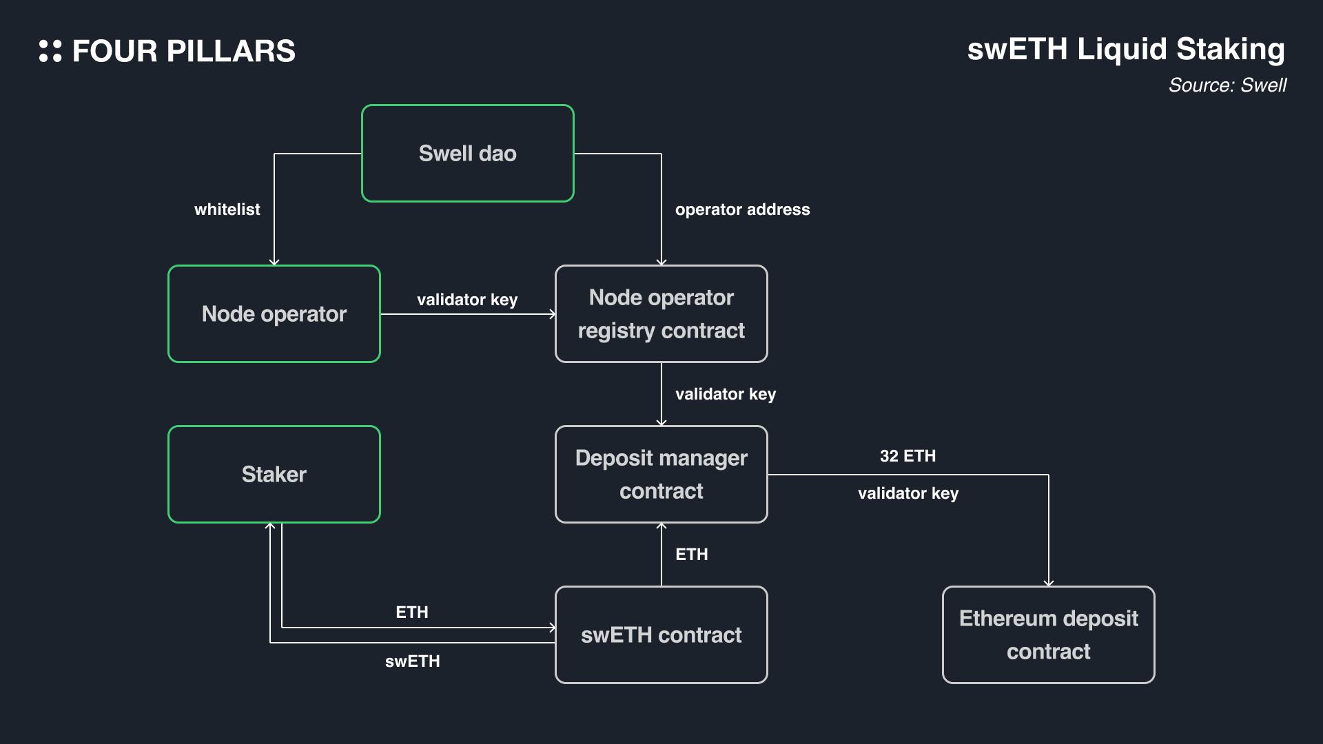 현재 InfStones, HashQuark, DSRV, Kiln, RockX, Blockscape, Stakely, snc.xyz 등 총 8개의 노드 운영자(Operator)들이 Swell 시스템을 관리 및 운영하고 있다. 노드 운영자들은 Swell DAO의 관리하에 화이트리스트 방식으로 노드 오퍼레이터 주소를 추가하면, 해당 주소가 Node operator registry contract에 등록된다. 그 이후 노드 오퍼레이터는 validator keys를 컨트랙트에 추가할 수 있는 권한을 갖게 된다. 향후 Swell 내의 유동성이 증가하고, DVT와 같은 리스크 방지 기술이 도입되어 안정성이 향상되면 무허가 방식으로 전환할 예정이다.