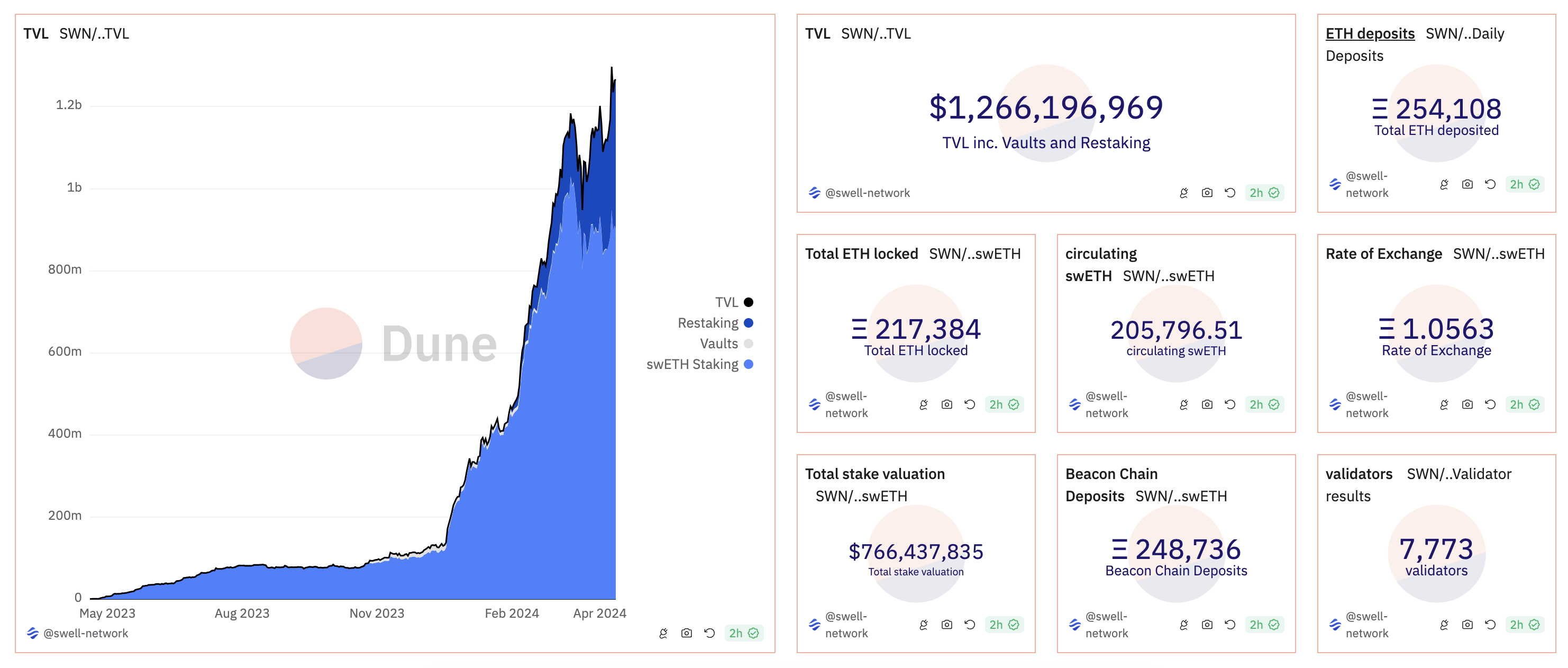dune 데이터에 따르면, Swell 리퀴드 스테이킹을 통해 ETH를 스테이킹한 사용자 수는 10만 명이며, 스테이킹된 ETH는 25만 개이다. 리스테이킹 서비스를 통해 ETH를 스테이킹한 사용자 수는 약 2만 명, 리스테이킹된 ETH는 10만 개로, 둘을 합쳐 총 1,266백만 달러 수준의 TVL을 보유하고 있다. 또한, EigenLayer를 통해 스테이킹된 swETH는 18만 개로, 이는 두 번째로 많은 LRT를 보유한 리퀴드 스테이킹 프로토콜이다.