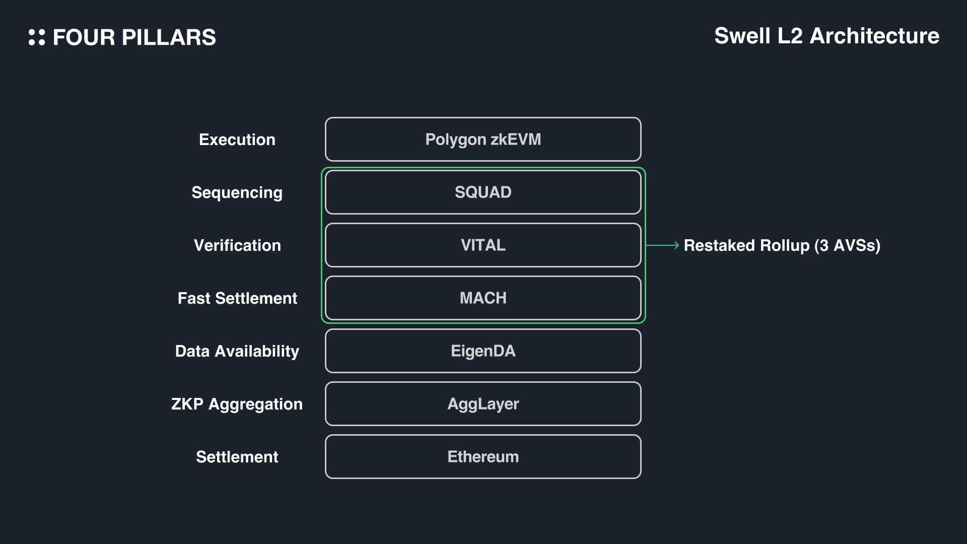Swell L2는 AVS 중 하나인 EigenDA를 사용하는 것 뿐만 아니라, AltLayer의 Restaked Rollup 프레임워크까지 사용함으로써 다양한 AVS들을 추가적으로 도입하여 탈중앙성, UX 등을 개선한다. Restaked Rollup은 3개의 AVS가 수직적으로 통합되어있는 시스템으로, 탈중앙 검증(decentralized verification)을 담당하는 VITAL, 빠른 완결성을 담당하는 MACH, 그리고 탈중앙 시퀀싱을 담당하는 SQUAD로 구성되어있다. 이들은 모두 리스테이킹된 ETH 외에도 롤업 토큰, AltLayer의 네이티브 토큰인 ALT 등의 경제적인 보안을 수혜받는다.