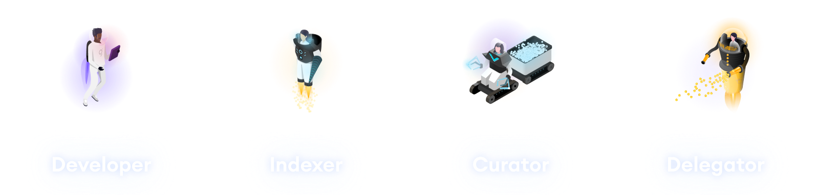 우선 더 그래프 네트워크는 인덱서와 큐레이터 그리고 델리게이터로 구성이 되어있다. 이들은 모두 웹3 애플리케이션에게 데이터를 제공해주는데 기여하는 주체들이라고 할 수 있다. 그리고 이들이 인덱싱하고 쿼리해주는 데이터를 소비하는 개발자도 더 그래프의 일부라고 할 수 있다. 이들이 가진 각각의 역할을 한 번 살펴보자: