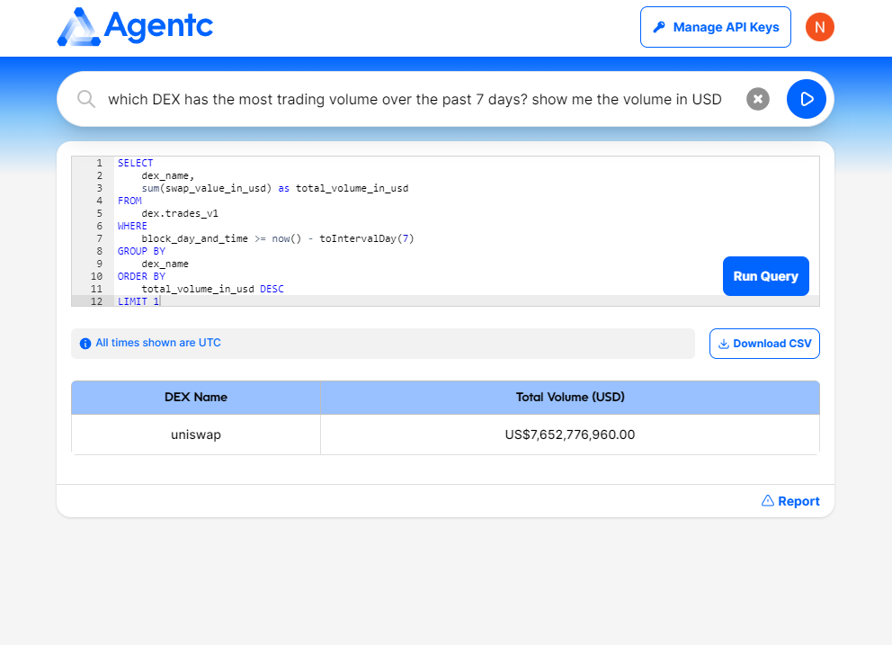 AgentC는 더 그래프에 있는 탈중앙 거래소에 대한 데이터들을 기반으로 만들어진 ChatGPT같은 툴이라고 볼 수 있다. AgentC는 필자와 같은 리서처들에게 굉장히 유용한 툴일 수 밖에 없는데, 그 이유는 온 체인 데이터를 보기 위해서 복잡하게 데이터를 분석하지 않아도 AgentC가 더 그래프의 데이터를 기반으로 내가 원하는 정보를 알려주기 때문이다. 위의 사진에서도 나와있듯 필자는 그냥 자연어로 어떤 탈 중앙 거래소가 지난 7일간 가장 많은 거래량을 소화해냈는지, 그리고 그 거래량이 얼마인지를 물어봤고, AgentC는 이를 직접 쿼리해서 거래소의 이름과 지난 7일간의 볼륨을 USD로 환산하여 알려줬다. 물론 아직까지 데모이기 때문에 데이터 표본 자체가 크진 않지만(AgentC는 지금 약 7개의 상위 DEX의 데이터만 학습한 상황이다). 더 그래프가 지원하는 모든 체인과 애플리케이션에 대한 데이터를 학습한다면, 필자와 같은 리서처에게 매우 좋은 분석 툴이 될 것이라고 생각한다.