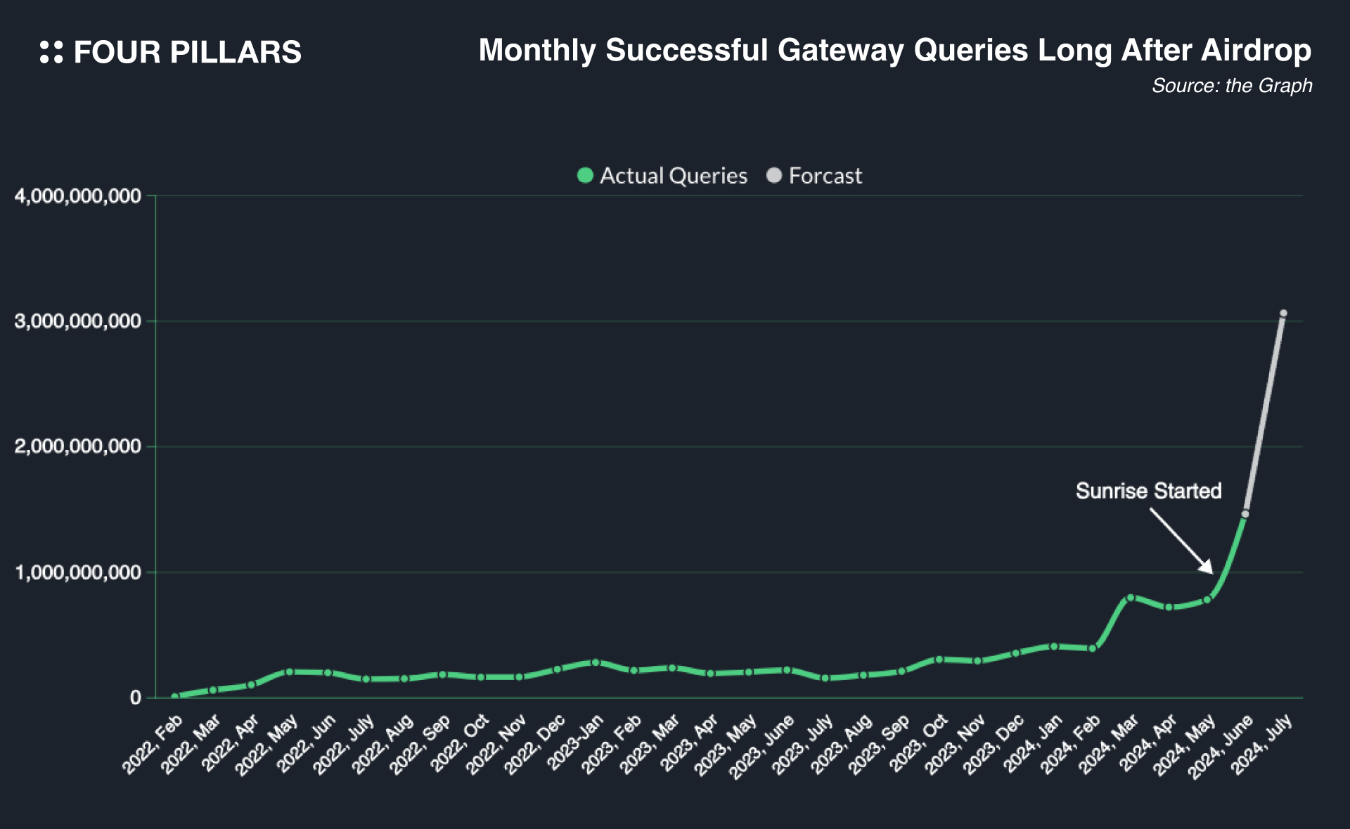 (위 그래프는 더 그래프에서 처리하는 쿼리의 수를 월간으로 정리해서 나타낸 것이다. 쿼리의 수가 갑자기 늘어난 이유는, 여태까지 더 그래프의 대부분 쿼리들이 중앙화 되어있는 주체들에 의해서 처리되었다가, Sunrise 이후로탈 중앙화된 네트워크가 처리하기 시작했기 때문이다. Sunrise는 그것을 탈 중앙화하는 이니셔티브로, Sunrise 이후에 쿼리량이 폭등하는 것을 볼 수 있다. 회색으로 표기한 부분은 앞으로 처리할 쿼리를 예측한 것으로, 7월이 다 끝나지 않은 시점인 지금 7월의 쿼리까지 표기하기 위해서 7월1일부터 지금까지 일간 평균 쿼리양을 기준으로 월간 쿼리양을 계산해서 표기하였다.)
