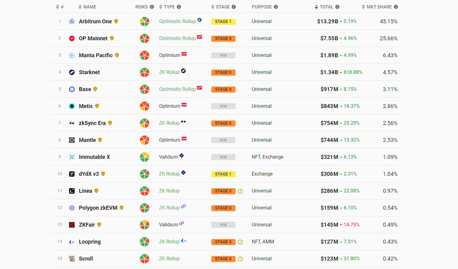 롤업 중심의 이더리움 생태계에서 가장 초기에 빠른 속도로 성장한 방식은 옵티미스틱 롤업이다. 옵티미스틱 롤업은 트랜잭션 데이터를 이더리움 네트워크에 저장하여 이더리움의 강력한 보안을 상속받으며, 모든 트랜잭션을 일단 타당하다고 가정하여 빠르게 처리하고, 추후에 사기 증명(fraud proof) 과정을 통해 타당성을 검증한다. 옵티미스틱 롤업 빌딩의 난이도는 zk롤업에 비하여 간단하기 때문에, 수 많은 옵티미스틱 롤업 생태계들이 먼저 빠르게 성장하였으며, 대표적인 예시로 Optimism과 Arbitrum이 있다. 이들은 단일 생태계를 넘어 각각 OP-Stack, Arbitrum Orbit과 같은 L2 SDK까지 선보이며 생태계의 확장까지 이룰 수 있었다.