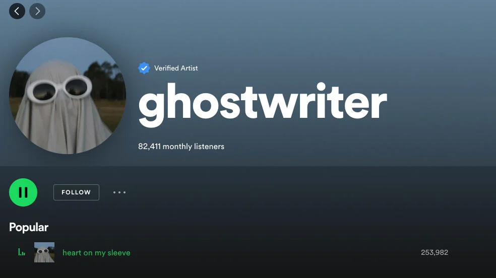 Drake와 The Weeknd의 ‘Heart on My Sleeve’라는 트랙은 2023년 2분기에서 가장 뜨거운 반응을 얻은 곡이었는데, 문제는 그 둘이 발표한 것이 아닌, 어떤 익명의 틱톡 유저 ‘ghostwriter977’에 의해서 두 아티스트의 AI에 의해서 생성된 목소리를 통해서 만들어진 곡이라는 것이다. Heart on My Sleeve는 4월 4일에 전체 음원 스트리밍 플랫폼에 공개된 이후, 4월 17에 UMG에 의해서 내려갔는데, 그 짧은 기간 동안에만 스포티파이에서는 600,000 스트리밍, 유튜브에서는 275,000 조회수, 틱톡에서는 +15M 조회수를 기록하였다. 천개가 넘는 틱톡 영상들이 만들어졌으며, 빌보드는 해당 곡이 전체적으로 약 $9400의 수익을 거뒀을 것이라고 예상하였다. 만약 Drake나 UMG에서 자체적으로 만든 것이라면, 엄청난 바이럴 마케팅의 일환이겠지만, 그것이 아니라면 해당 곡은 누구나 AI의 도움을 받아서, 내가 원하는 가수의 목소리로 내가 원하는 곡을 만들 수 있는 시대가 시작되고 있음을 알리는 증거이다.
