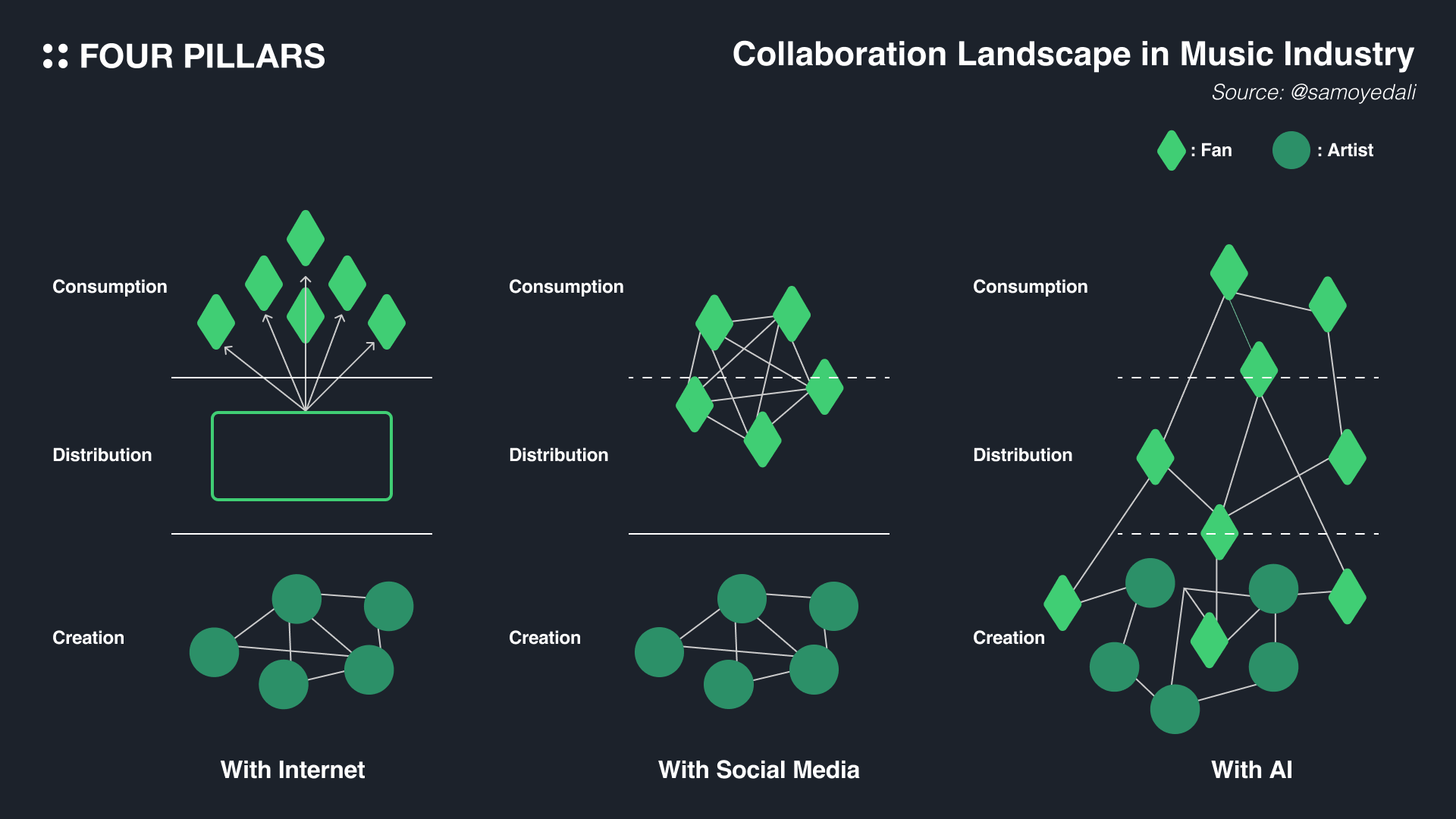 종합해보면, 인터넷, 소셜 미디어, AI라는 기술의 등장과 상용화에 따라서, 음악이라는 공급망에 관여하는 사람들 간의 협업이 더 쉬워지고, 활발해졌다. 인터넷이 등장하면서, 아티스트들 간의 협업이 활발해졌고, 소셜 미디어가 등장하면서 아티스트와 그 소비자들간의 협업이 활발해졌고, AI와 함께 아티스트와 소비자 간의 경계가 모호해지고, 협업의 범위도 늘어나고 있다. 특히 AI 전에는 아티스트와 소비자 간의 협업이 유통과 홍보에 제한되었다면, 이제는 애초에 음악을 만드는 단계에서부터 협업이 일상화될 것이다. 예를 들어, Drake 팬들은 이번 Drake의 새로운 앨범이 마음에 들지 않는다면, 자기들이 원하는 스타일의 곡에 Drake 목소리를 붙혀서 DIY해서 듣기 시작할 것이다.